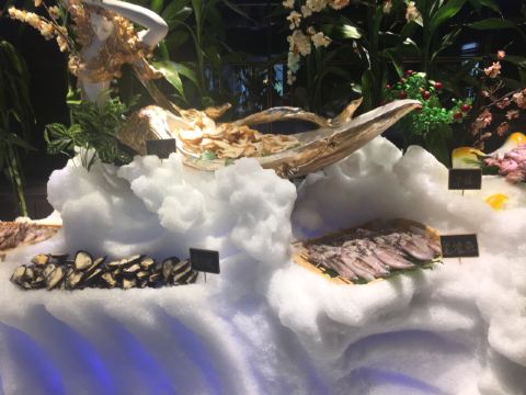 三文鱼,鲍鱼,蒜蓉粉丝烤扇贝,烤生蚝,螃蟹,鲜榨果汁,烤串,北京烤鸭,甜点蛋糕,海鲜汁,黑蒜烤生蚝,鲜切牛肉,虾片,火锅,烤鸭