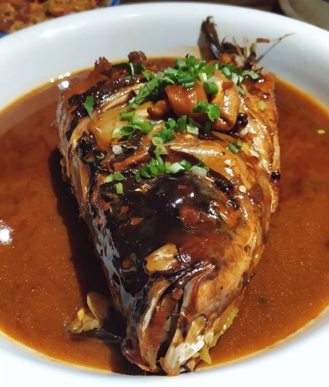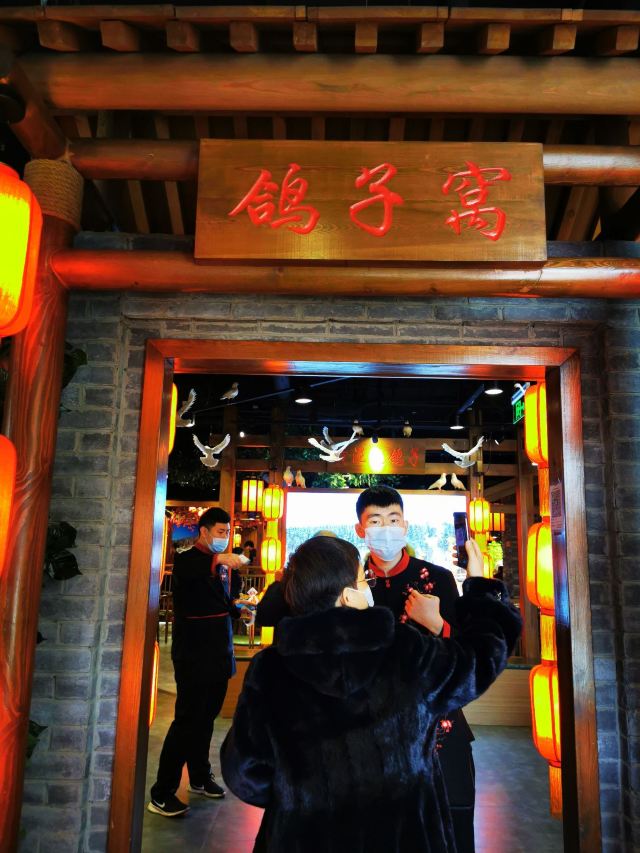 唯愿岁月静好第一次来位于万丰路的鸽子窝吃饭,远远望去,金碧辉煌,门庭若市,有免费停车场,目测也不太小,可来就餐的客人太多了,车场爆满。 就餐环境干净,假山、小亭子一应俱全,地方很大,没有菜单,都在两边有菜的模型和价格,点餐时有服务员跟随记录。 点了网友推荐的黄泥烧鸽子,酱鸽子后告之没了,烧鸽子,个头不小,切成两半,用手撕着吃,嚼在嘴里,肉香有嚼劲。 大锅炖鱼头很香,一点土腥味都没有,鱼头虽然大,但鱼肉很入味,绝对是炖了很长时间的,很鲜美! 柴鸡蛋炒鬼子葱,出乎意料的好吃,鬼子葱甜甜的,嫩嫩的,配上红绿小米椒,微微带辣,鲜美味道盖过了柴鸡蛋的香。 养生小炒、韭菜盒子中规中矩。 养生花果茶的味道很惊艳,酸酸甜甜热热的,喝下去舒服极了! 晾衣大饼也太太太好吃了吧,金灿灿的,飘着奶香味,挂在铁架上,完全是色香味俱全嘛!吃在嘴里,奶香十足,煊软香甜,这哪里是大饼,更像是刚出炉的手撕面包,太香了! 除了菜香是亮点外,传菜的小机器人也是招人喜欢,奶声奶气的发音,上菜时,“小主、小主”叫的人满心欢喜,遇到有障碍物时,“哎呦,过不去了喽”,萌萌哒!孩子忍不住追逐其后。 总之,这家东北菜馆不仅高大上,而且菜的味道也很不错,值得推荐,还会再光顾。