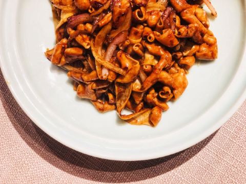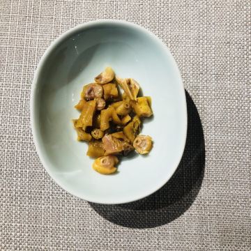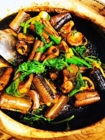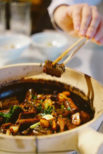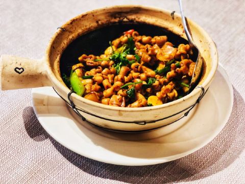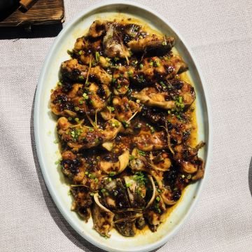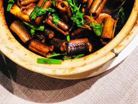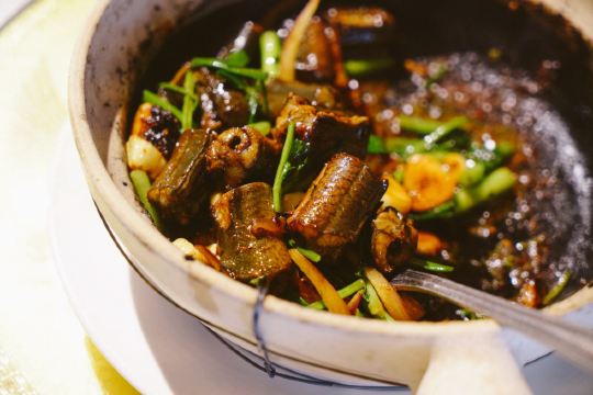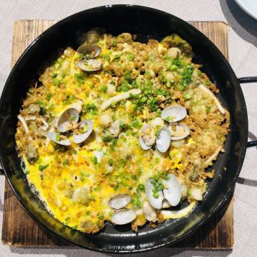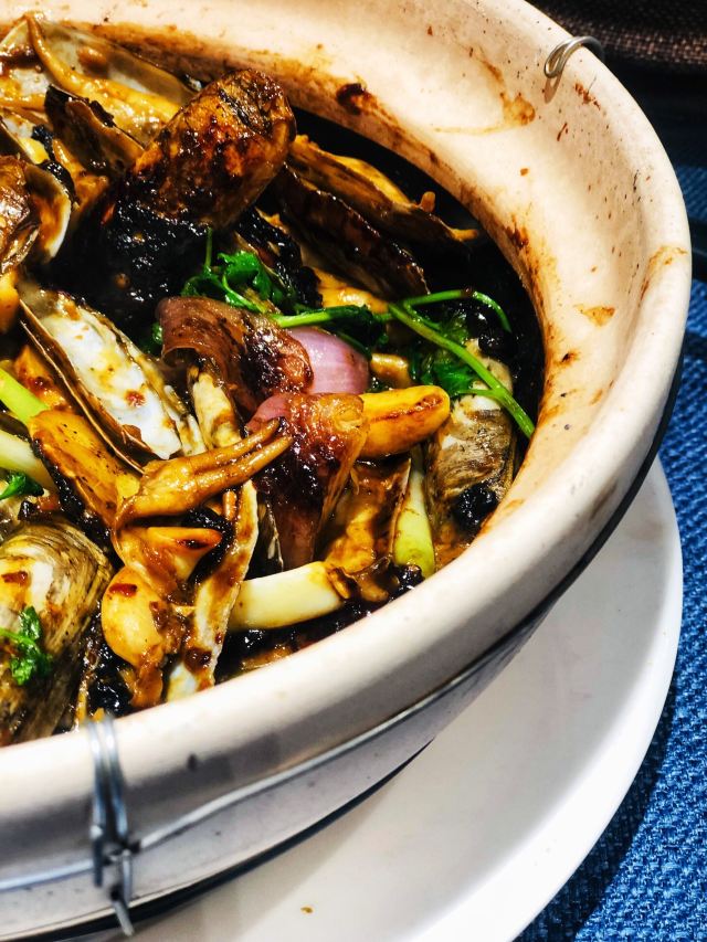 枫行Maple菜单薄薄一页,看得我心花怒放。一个北方人生了一个南方胃,只看这些诱人的菜名,已经食指大动了。 1️⃣「原创生啫黄鳝」啫啫是潮粤菜系必点料理之一。把食材放于小砂锅中,经过极高温的烧焗后,瓦煲中的汤汁不断快速蒸发而发出“嗞嗞”声,“嗞嗞”粤语发音为“啫啫”,于是广州人将其命名为啫啫煲。啫啫煲最早是广州街头大排档的产物,后来逐渐进入粤菜酒楼的菜单中。肉菜、素菜都可以用这种方法料理。 生啫黄鳝煲是粤食家十大必点,端上来后,会现场快速搅拌,锅气十足。鳝鱼段非常肉头,没有土腥味,生啫后Q弹。搭配的大葱大蒜,也很好吃,我们竟然吃到啥也没剩。 2️⃣「啫啫蚝仔海鲜烙」十分推荐。盛在铁盘中端上来,现场分切,有点西餐的仪式感。 用蚝仔、薯粉、鸡蛋、蛤蜊、鱿鱼丁、香葱煎出来,虽然油炸,但非常好吃。边缘焦焦酥酥,沾一点泰式酸甜辣酱,一人吃半张一点不费力。