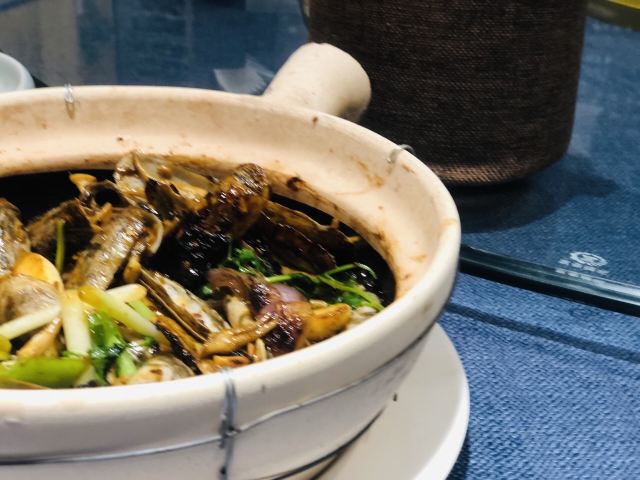 菜单薄薄一页,看得我心花怒放。一个北方人生了一个南方胃,只看这些诱人的菜名,已经食指大动了。 1️⃣「原创生啫黄鳝」啫啫是潮粤菜系必点料理之一。把食材放于小砂锅中,经过极高温的烧焗后,瓦煲中的汤汁不断快速蒸发而发出“嗞嗞”声,“嗞嗞”粤语发音为“啫啫”,于是广州人将其命名为啫啫煲。啫啫煲最早是广州街头大排档的产物,后来逐渐进入粤菜酒楼的菜单中。肉菜、素菜都可以用这种方法料理。 生啫黄鳝煲是粤食家十大必点,端上来后,会现场快速搅拌,锅气十足。鳝鱼段非常肉头,没有土腥味,生啫后Q弹。搭配的大葱大蒜,也很好吃,我们竟然吃到啥也没剩。 2️⃣「啫啫蚝仔海鲜烙」十分推荐。盛在铁盘中端上来,现场分切,有点西餐的仪式感。 用蚝仔、薯粉、鸡蛋、蛤蜊、鱿鱼丁、香葱煎出来,虽然油炸,但非常好吃。边缘焦焦酥酥,沾一点泰式酸甜辣酱,一人吃半张一点不费力。