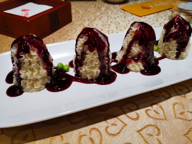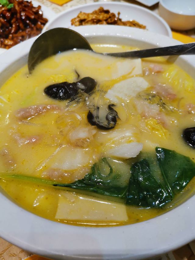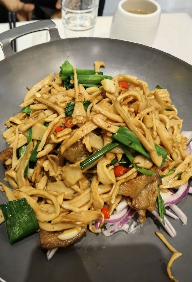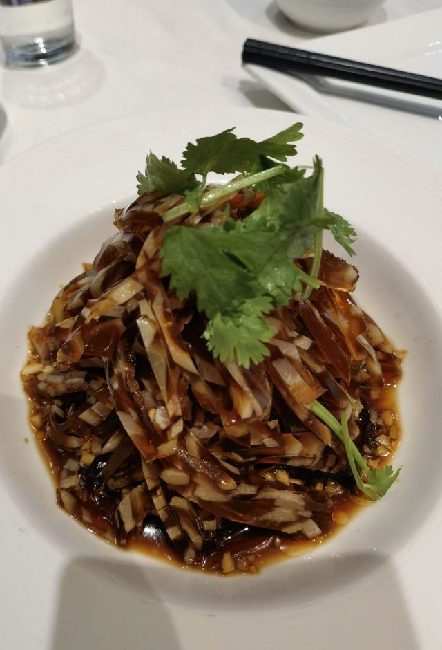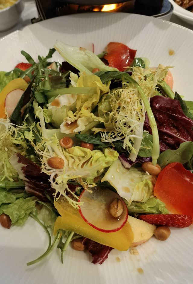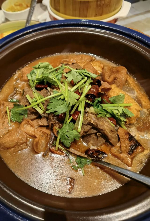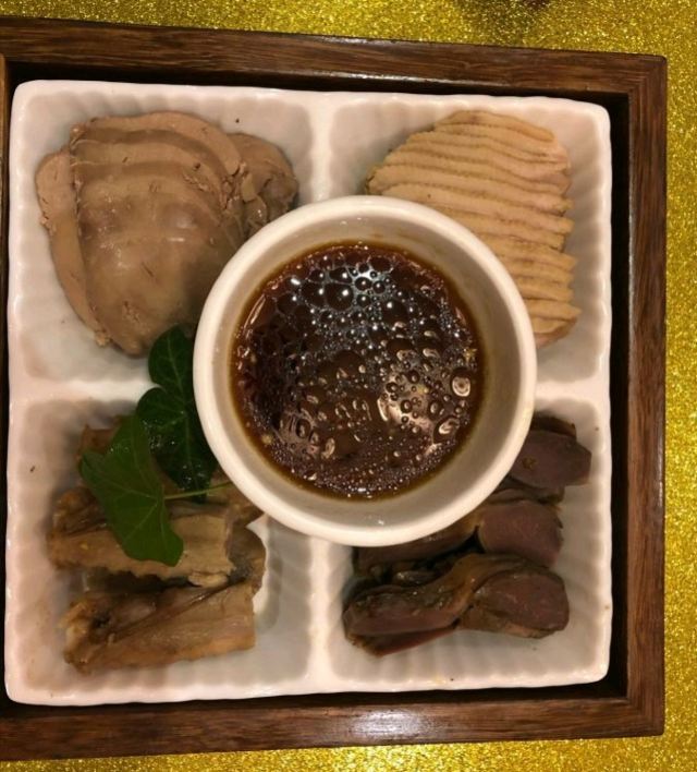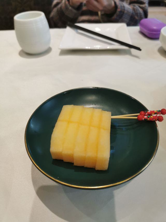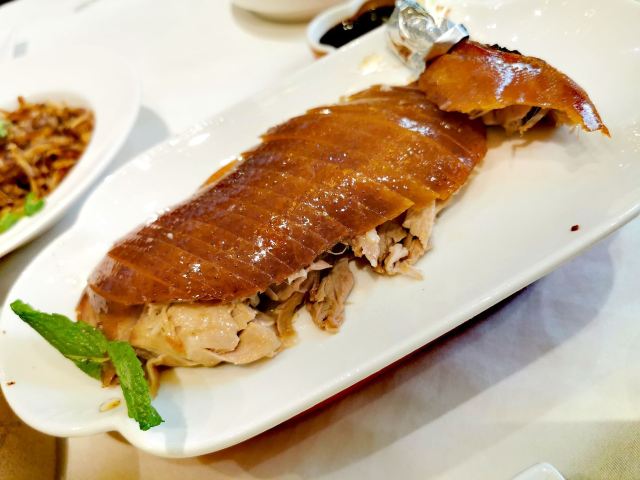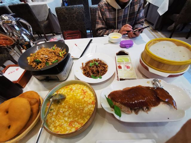 Dayali Roast Duck (Youanmen)2023年的好运,抽中某点评的大鸭梨烤鸭店免费双人套餐,要提前一天电话预订,平日中午饭点儿上座率超过70%,感觉人气不错。 说是双人套餐但菜量超预期,3人吃绰绰有余。餐前果盘是几块哈密瓜;凉菜蒜泥肉皮冻细腻滑弹韧劲恰到好处;蟹黄豆腐能吃出用料是咸鸭蛋加蟹肉棒,咸中带鲜爽滑可口,尚可吧,只是选配在双人餐中量略显大了,推荐可作4人以上就餐时的选择;干锅脆笋煨土猪肉入口脆爽略咸实属米饭绝配;镇店主打的京式烤鸭更是表皮色泽金黄油亮,外酥香而里肉嫩,配鸭饼蘸酱料裹卷入口别有一种特殊的鲜美味道,堪称美食享受;主食选了小油饼香酥微甜,只是肚子容量有限,只好打包回家细品了。 整体感觉,餐厅主打京味家常菜,菜品色香味均佳,服务中规中矩,食客回头客居多,进店就餐不会踩雷。