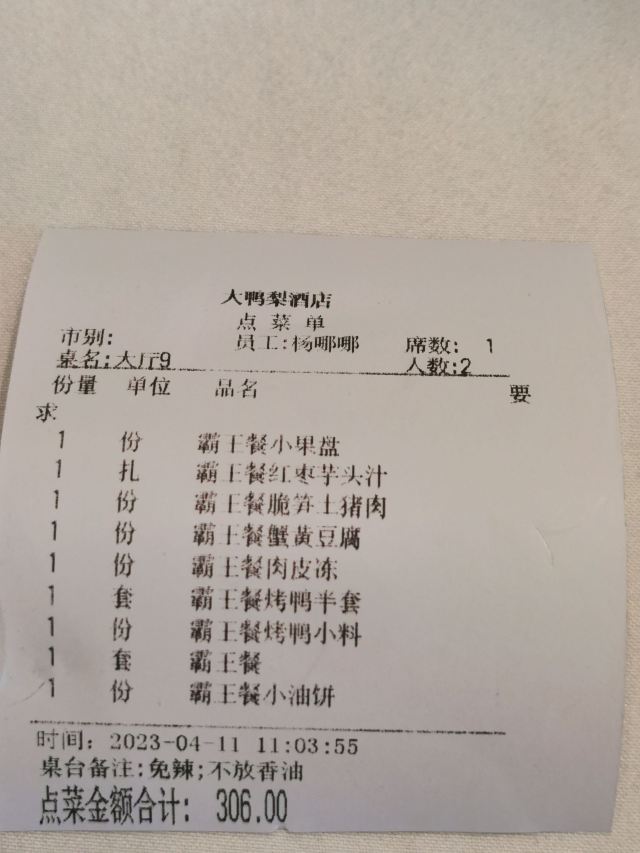 weijiandong2023年的好运,抽中某点评的大鸭梨烤鸭店免费双人套餐,要提前一天电话预订,平日中午饭点儿上座率超过70%,感觉人气不错。 说是双人套餐但菜量超预期,3人吃绰绰有余。餐前果盘是几块哈密瓜;凉菜蒜泥肉皮冻细腻滑弹韧劲恰到好处;蟹黄豆腐能吃出用料是咸鸭蛋加蟹肉棒,咸中带鲜爽滑可口,尚可吧,只是选配在双人餐中量略显大了,推荐可作4人以上就餐时的选择;干锅脆笋煨土猪肉入口脆爽略咸实属米饭绝配;镇店主打的京式烤鸭更是表皮色泽金黄油亮,外酥香而里肉嫩,配鸭饼蘸酱料裹卷入口别有一种特殊的鲜美味道,堪称美食享受;主食选了小油饼香酥微甜,只是肚子容量有限,只好打包回家细品了。 整体感觉,餐厅主打京味家常菜,菜品色香味均佳,服务中规中矩,食客回头客居多,进店就餐不会踩雷。