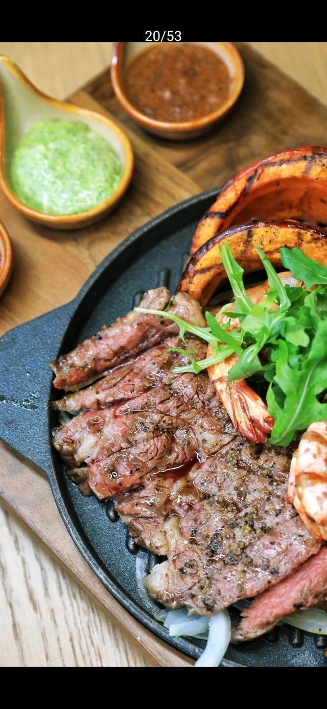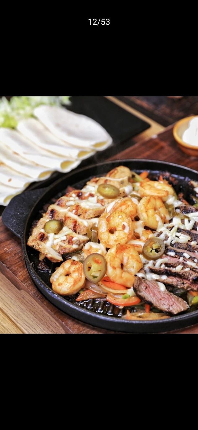 【拉美风味海陆铁板法士达盛宴】是之前“铁板牛肉墨西哥卷”的升级版。刚上桌的铁盘还呲呲冒着热气,包含了牛肉、鸡肉、大虾三种肉,下面铺着一层青椒洋葱等,并且搭配马苏里拉芝士碎,特别适合朋友一起分享来吃~