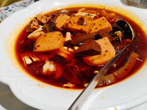 特别百度一下自贡盐帮菜属于川菜派系,其特点就三个字:香、辣、鲜!自贡的辣与麻辣不同,它突出的是鲜辣、香辣。 【菜品】|雾都毛血旺^很久没吃这么辣的菜了,挑着里面的午餐肉和毛肚我吃了一碗饭!菜单第一页有几个特价菜,每桌可以点一个,我要的土豆丝,免辣!另外还要了一碗免辣的小面[害羞]到川菜馆,我只敢点一道辣菜 【环境】听说这家和旁边的金山城好像是一个老板,难怪装修都那么像!尤其是水晶灯,看半天感觉在哪儿见过 【服务】服务员都很干练,上菜,换盘子,收拾桌子都可麻利了。中午这边吃饭人真多,手脚不快的话,估计都赶不上翻台。