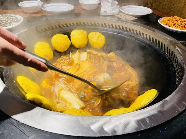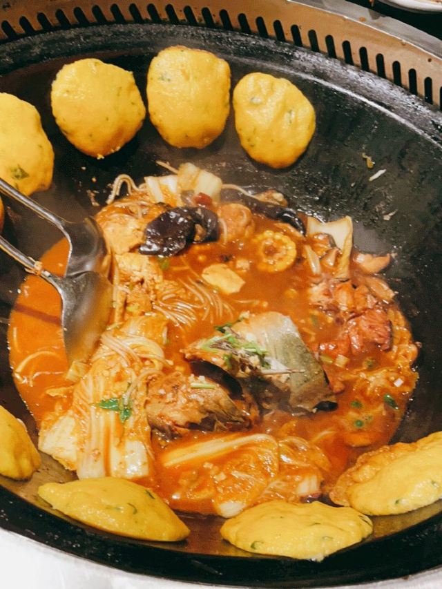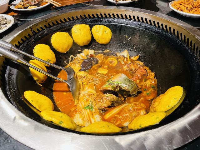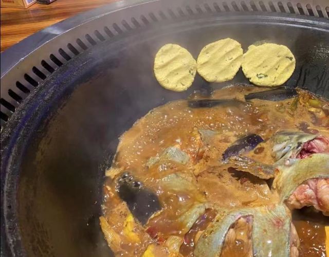 周末几个朋友约在那里吃饭,几个人围在一个大铁锅周围,非常适合冬天去吃,感觉特别热闹和暖和。这家的凉拌菜拌的味道不错,在等待炖鱼的时间里可以先垫点肚子。铁锅炖出来的大鱼味道鲜美,锅上面贴的饼子也是混着香味。总体感觉挺不错的,适合朋友小聚。