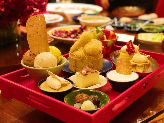 老式果木烤鸭,精选四冷碟,脆炸烧内蒙羊排,麻酱烧酿海参,自制泡菜炒安格斯牛肉,长安壹号甜品拼盘,脆葱酱烧大黄鱼,【花雕鸡尾酒】“姜”进酒,罗氏虾煮酥肉萝卜丝,三杯罗勒鳕鱼煲,宫保鸡丁,富贵鸡,樱桃排骨,蒸焗有机南瓜,北京烤鸭