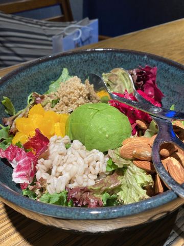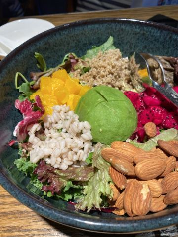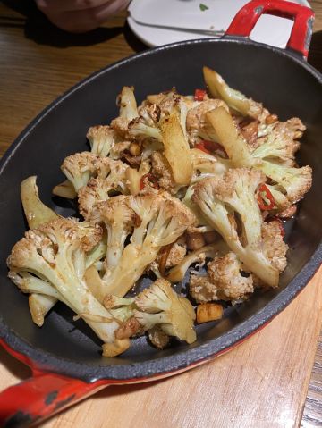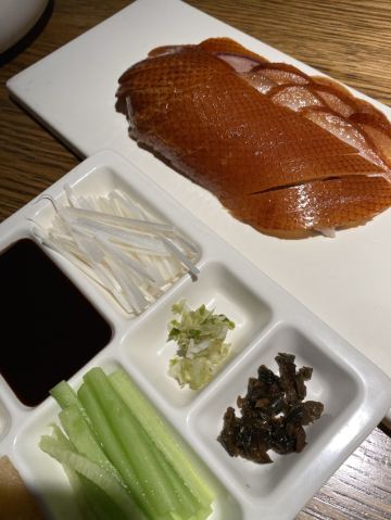 「“酥不腻”烤鸭」确实名副其实,特别好吃!尤其是鸭皮蘸白糖也太好吃啦!酥脆香甜的口感。 「鸭汤」鸭汤可以续碗,白胡椒很提味,合起来很顺口也不会腻,也不会像有些店的鸭汤飘着油花,他家不错。 「芥子酱羽翼甘蓝沙拉」满满一大碗,蔬菜🥬和水果都很新鲜。水果也很甜,里边大颗的杏仁吃起来很过瘾。 「椒麻鸡翅」花椒的味道很重,第一次吃这种口味的,味道很好鸡翅很嫩。 「腩肉焗菜花」菜花🥦居然很好吃!干锅爆炒的感觉,闻着就很香,这个可以点。 「冰淇淋」餐后甜品选的冰激凌🍦,颜色也太少女了,味道也很好,不会过甜。 服务: 服务员态度很好,添水也很及时。菜品不错,简单的菜品也会做的很出彩基本不会踩雷,总之很推荐来他家尝尝。