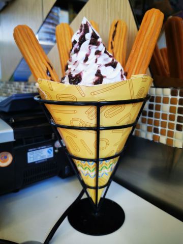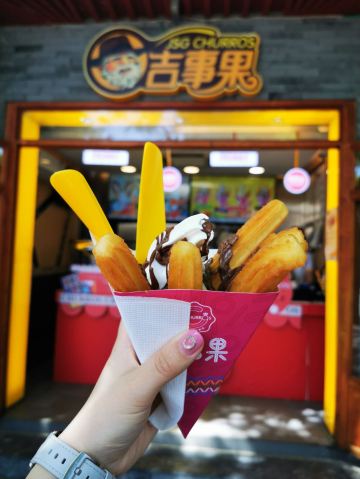 每次来南锣必须要吃的吉事果[调皮] [环境]应该是从南锣鼓巷进去的第一家吉事果,店铺很干净,工作日也不是很多人。 |榛子牛奶吉事果^招牌产品,炸的热乎乎的搭配冰激凌,非常好吃。一份有五根,适合两个人一起分享。