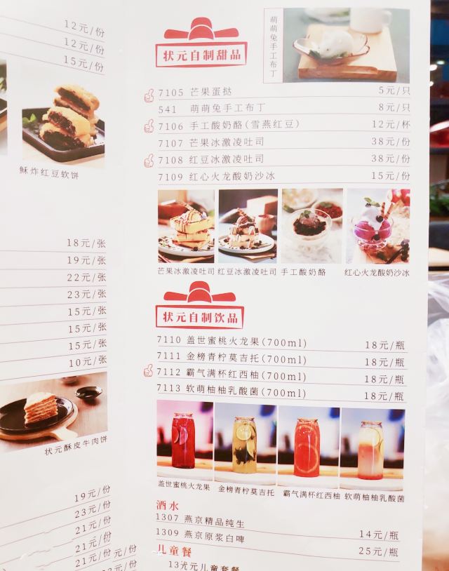 状元皮蛋瘦肉粥,状元扁豆焖面,酱香牛肉饼,状元八宝粥,状元五黑粥,壮元红烧肉,状元小肉饼,红豆软饼,扁豆焖面,山药全麦山楂冰粥,时蔬焖面,状元五仁冰粥,状元招牌海鲜粥