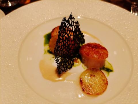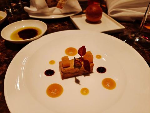 Tavola Italian Dining1P.美丽时光·巴黎艺术经典香槟 2P.手指饼干&西米薄脆&芝士番茄球&48小时发酵扁面包 3P.嘉雅朗格山罗斯巴斯莎当妮法定产区干白葡萄酒 2019 4P.北海道扇贝,热那亚风格青酱,起泡酒浓缩 5P.鹅肝批,柿子酱,波特酒汁 6P.手工意式宽面,加纳边尼露红虾,罗勒 7P.布列塔尼蓝龙虾,胡萝卜,烤玉兰菜,龙虾浓缩 8P.澳洲西冷和牛9级,绿芦笋,羊肚菌酱汁 9P.凯隆世家酒庄干红葡萄酒 1996