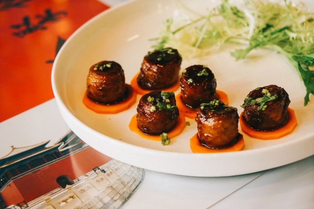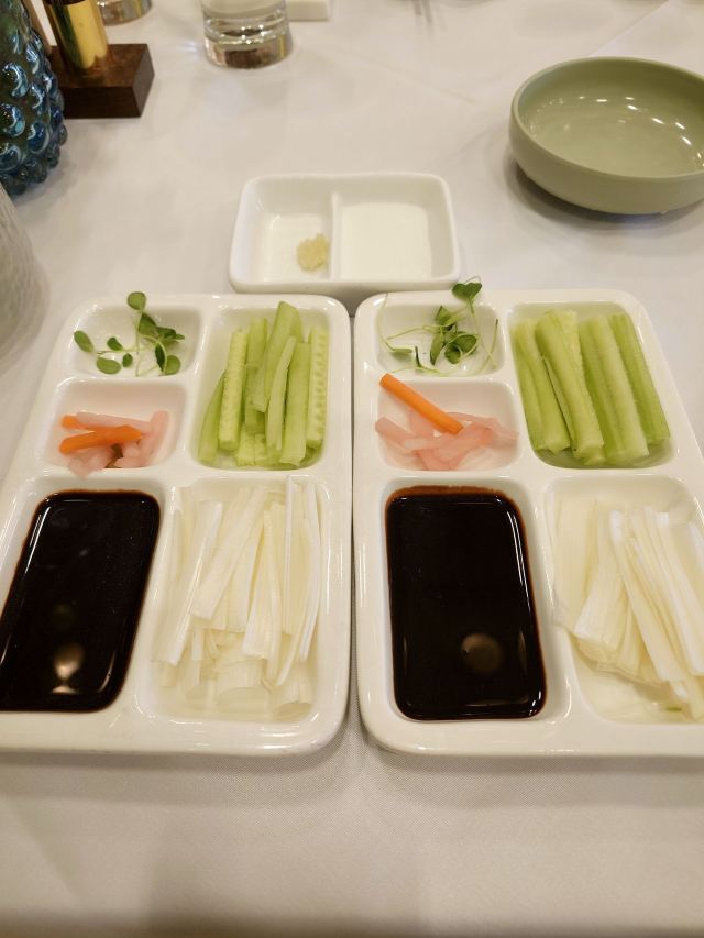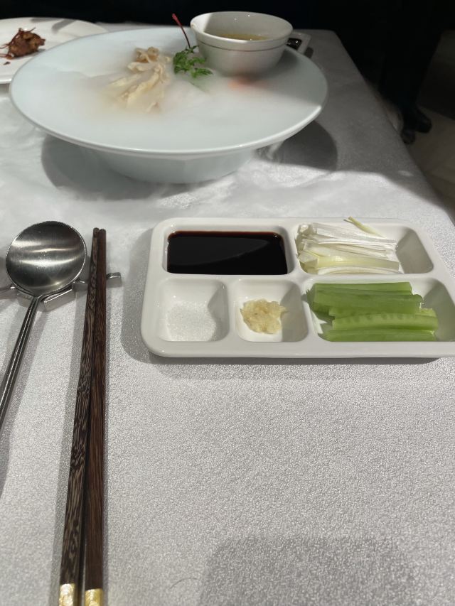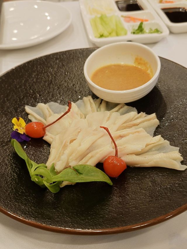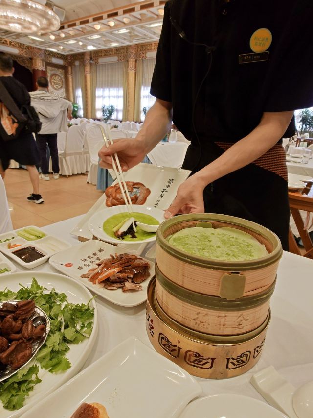 枫行Maple和平门总店真的是超级大,好几层,可商务宴请,可家庭小聚。提前预约可以坐到包间。 包间有不同的主题,我们做到的门票厅,墙上挂了不少老门票,看看那时候几毛一张的公园年票,是不是立刻点燃了回忆? 🍽美食攻略: 1️⃣[芥末鸭掌],全聚德著名的就是各种鸭肴,这道芥末鸭掌价格不菲,在摆盘上还是费了心思,端上来的时候腾云驾雾。芥末是传统的黄芥末,不习惯的一定要少沾一点,以免闹得眼泪鼻涕横流。其实这道菜很多卖烤鸭的餐厅都有,但有些是水泡发的,只有常吃的人才能分辨出来。鸭掌脆脆的,很Q弹,可以算是到店必点。 2️⃣[全聚德盛世牡丹烤鸭],烤鸭是必点项目。片烤鸭一定会当着顾客的面儿,看师傅手起刀落行云流水,不得不说是种享受。