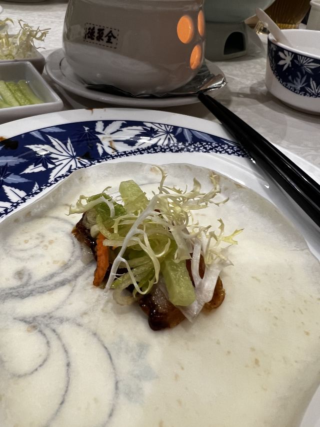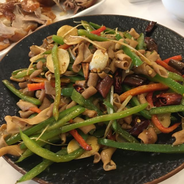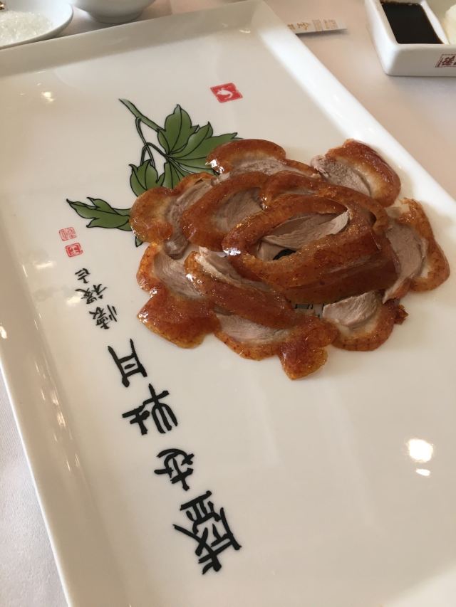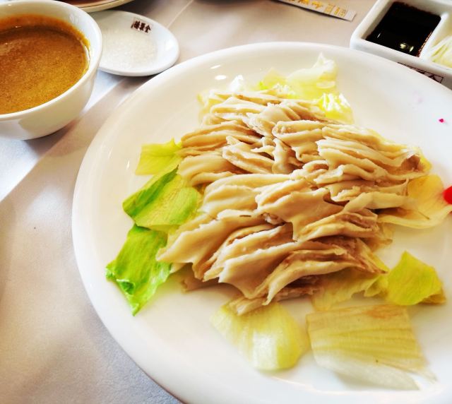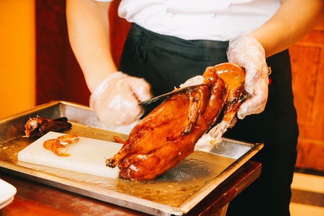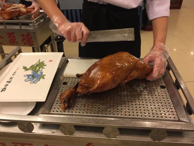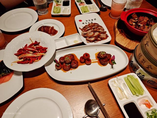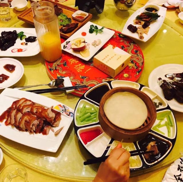 和平门店已经是全聚德和北京的标志,招牌果木烤鸭肥嫩鲜香,大厨当面将鸭肉一片片的切下,肥瘦均匀,足见刀工;鸭肉卷饼口感丰富,味道香甜,来全聚德不点烤鸭等于没来!