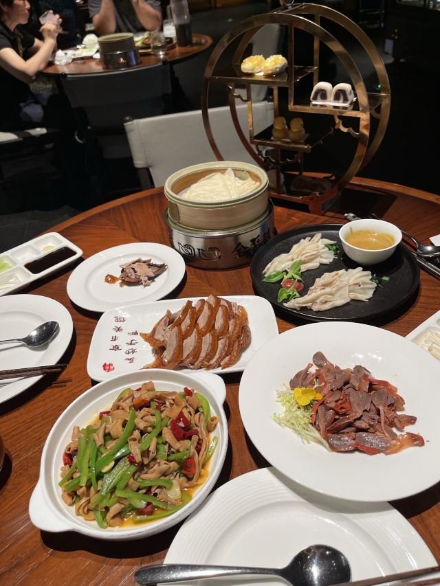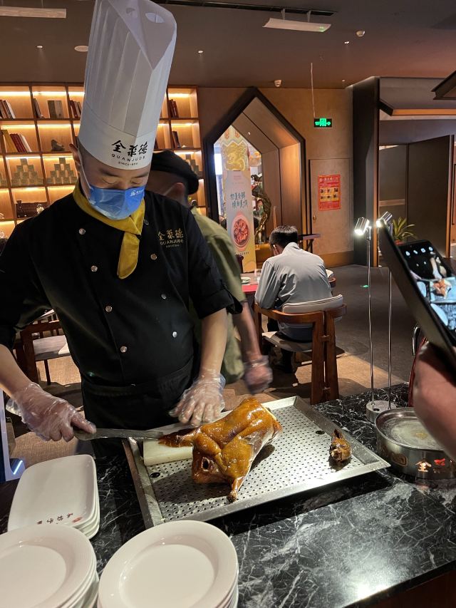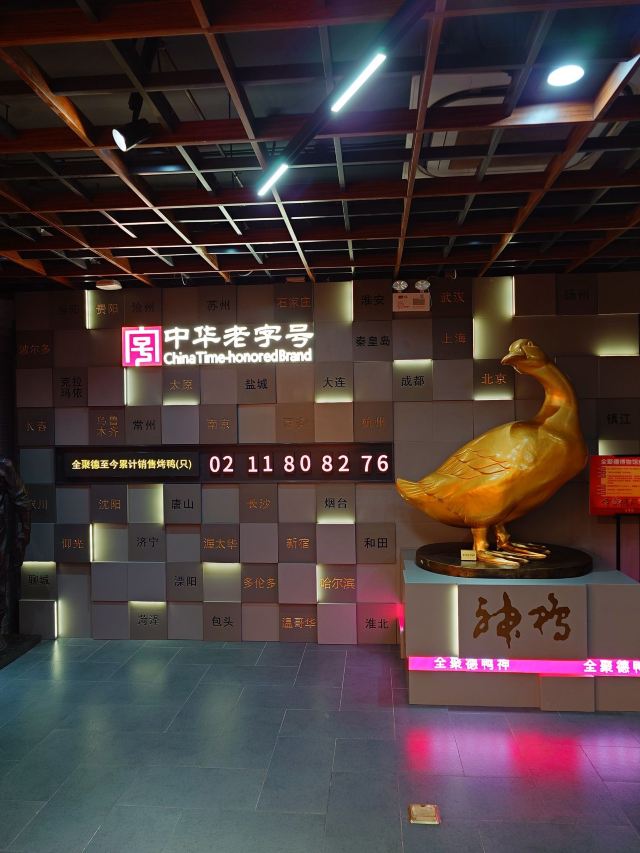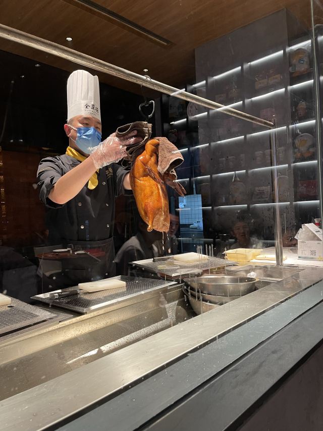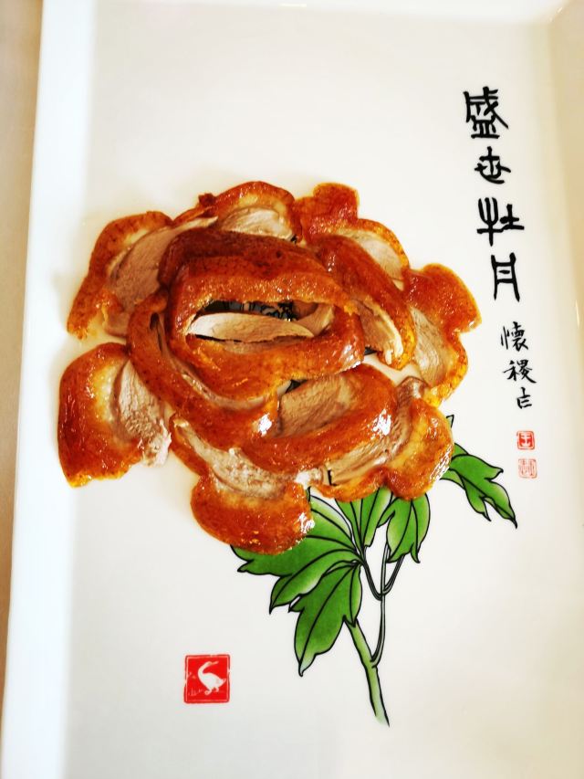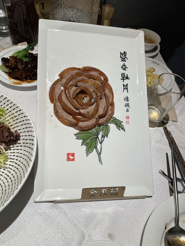 一生平安有身份证的烤鸭。 环境:尽量提前预定一楼或三楼座位。初来乍到,进店服务员就让去的四楼,四楼是宴会大厅那种,装修老点。其实一楼的小餐桌很有特色。 七楼有全聚德博物馆,可以捎带脚遛遛,免费开放。 每只烤鸭有自己的一张编号卡,高级感噌的一下就上来了。 全聚德盛世牡丹^适合打卡拍照,造型漂亮,16片极品部位。 服务:烤鸭师傅现场片,服务员总体素质高,示范卷鸭、倒水、盛汤,清盘等总体服务还行。面酱葱丝和鸭汤是免费续的,这些“实惠”上来主动介绍给顾客会更好(走了之后才知道的)。 口味:鸭子不腥没有邪味,整体口味比较含蓄(就是没滋没味),芥末鸭掌必点。 性价比:怎么说呢,一般般吧。