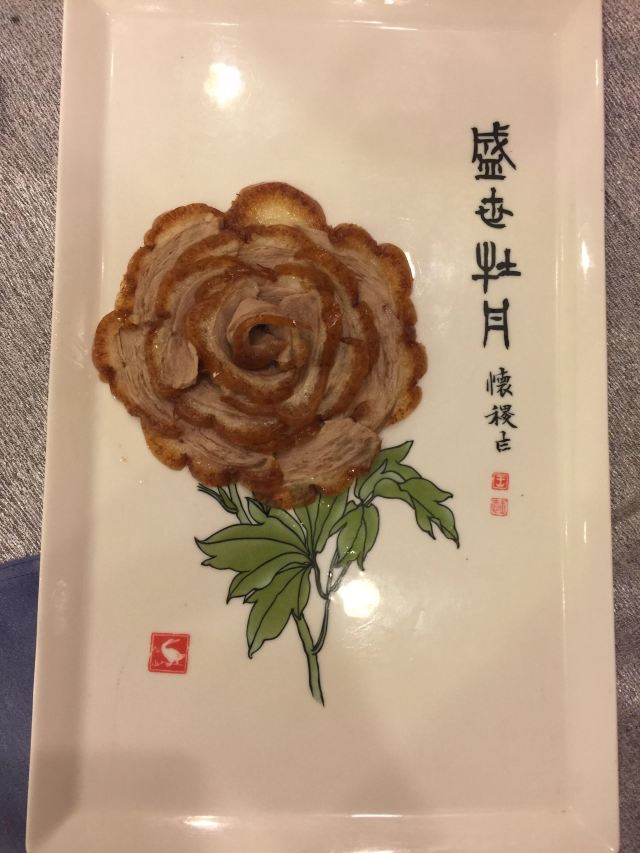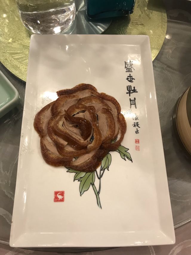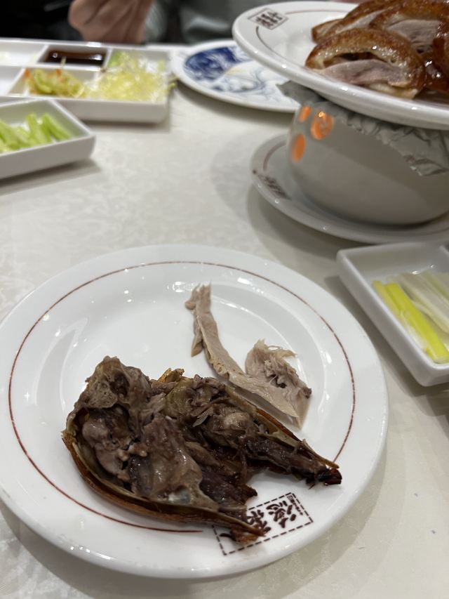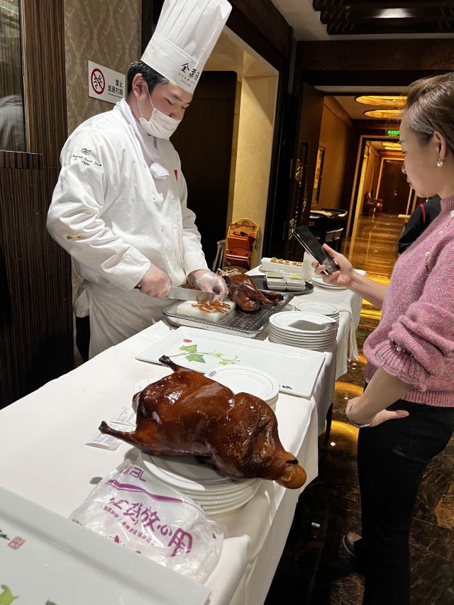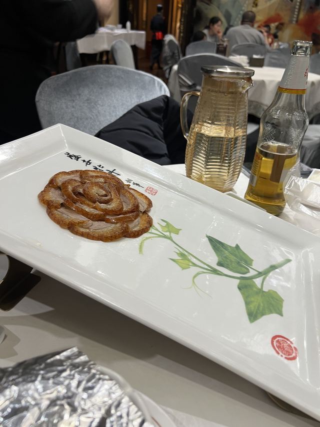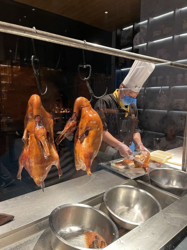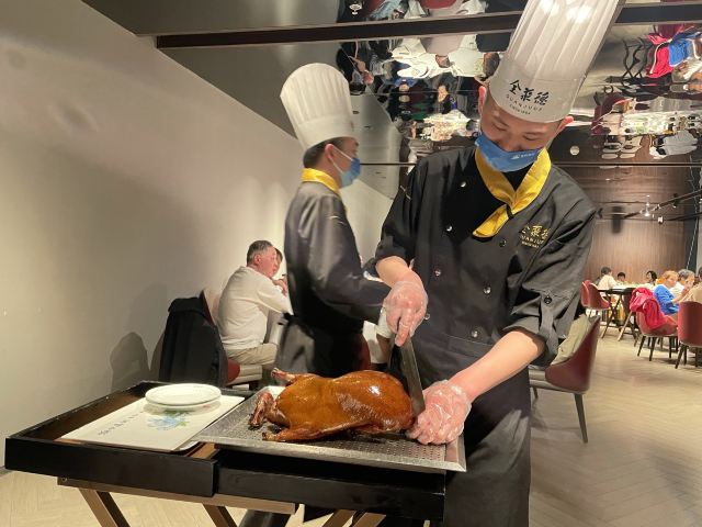 一生平安有身份证的烤鸭。 环境:尽量提前预定一楼或三楼座位。初来乍到,进店服务员就让去的四楼,四楼是宴会大厅那种,装修老点。其实一楼的小餐桌很有特色。 七楼有全聚德博物馆,可以捎带脚遛遛,免费开放。 每只烤鸭有自己的一张编号卡,高级感噌的一下就上来了。 全聚德盛世牡丹^适合打卡拍照,造型漂亮,16片极品部位。 服务:烤鸭师傅现场片,服务员总体素质高,示范卷鸭、倒水、盛汤,清盘等总体服务还行。面酱葱丝和鸭汤是免费续的,这些“实惠”上来主动介绍给顾客会更好(走了之后才知道的)。 口味:鸭子不腥没有邪味,整体口味比较含蓄(就是没滋没味),芥末鸭掌必点。 性价比:怎么说呢,一般般吧。
