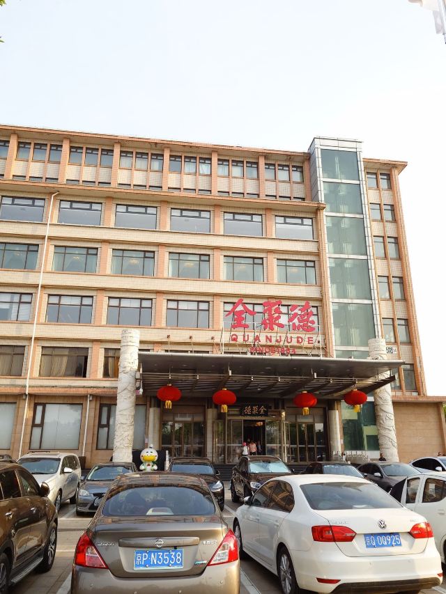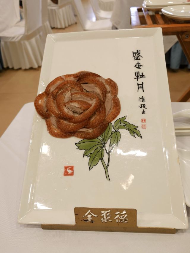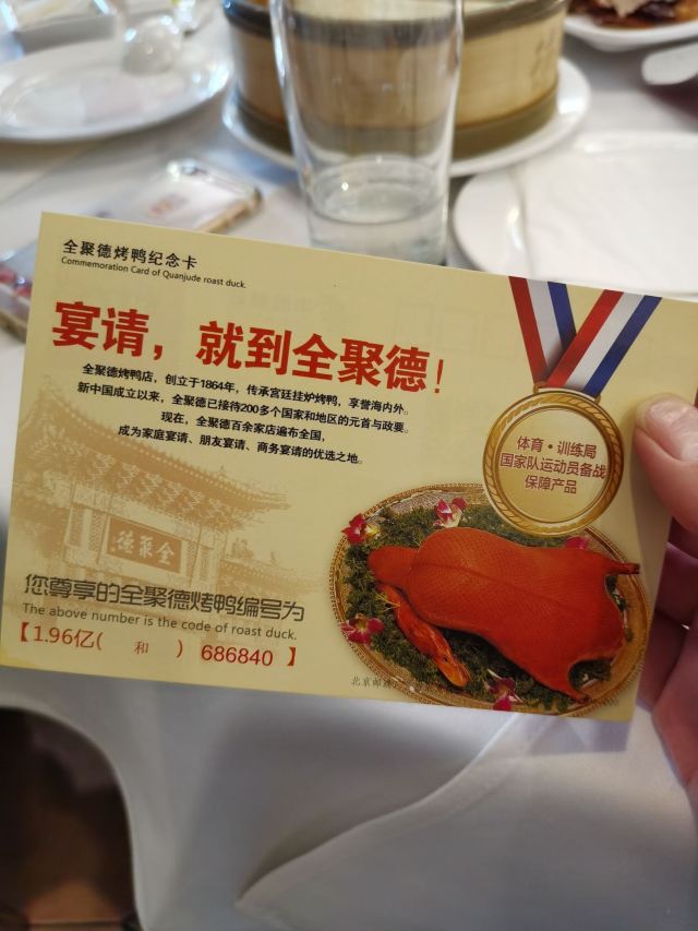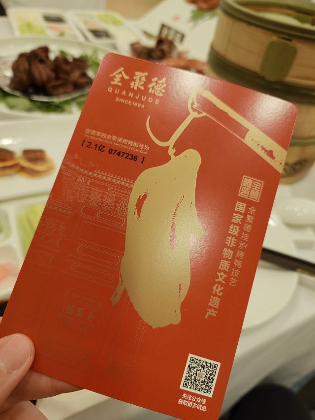 QUAN JU DE有身份证的烤鸭。 环境:尽量提前预定一楼或三楼座位。初来乍到,进店服务员就让去的四楼,四楼是宴会大厅那种,装修老点。其实一楼的小餐桌很有特色。 七楼有全聚德博物馆,可以捎带脚遛遛,免费开放。 每只烤鸭有自己的一张编号卡,高级感噌的一下就上来了。 全聚德盛世牡丹^适合打卡拍照,造型漂亮,16片极品部位。 服务:烤鸭师傅现场片,服务员总体素质高,示范卷鸭、倒水、盛汤,清盘等总体服务还行。面酱葱丝和鸭汤是免费续的,这些“实惠”上来主动介绍给顾客会更好(走了之后才知道的)。 口味:鸭子不腥没有邪味,整体口味比较含蓄(就是没滋没味),芥末鸭掌必点。 性价比:怎么说呢,一般般吧。