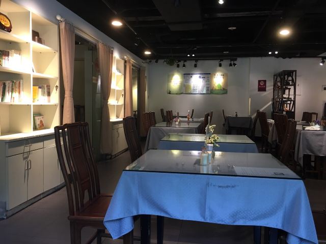 天厨妙香是一家素食店,主营川、湘口味的素食,无烟、无酒、无蛋、无肉、无五辛是餐厅的五大特色, 餐厅装修简洁明快,黑色、白色和绿色得到了很好的融合,将原有的水泥地铺成甲板色、绿色的餐桌、原木的椅子,还有占据了整整一面墙的书柜。