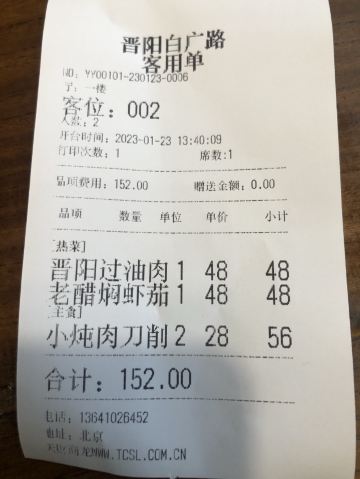 晋阳饭庄是老字号馆子,主营山西菜,这家在白广路和枣林前街路口,离我家很近,快过年了一家三口过来小聚一番,也算吃个小规模的团圆饭。店里环境很好的,有点儿晋中大院的感觉,服务也热情,不错。因为在山西生活了六年,现在还有好多朋友在山西,所以对山西很有感情,山西特色菜也很吃得惯。今天因为照顾孩子口味,所以没点太多山西菜,不过面食是一定要点的,来个刀削面,大家都说好。香酥鸭是店里招牌菜之一,香脆软烂,吃得过瘾。糖醋排骨、捞汁肥牛、椒麻鸡也都不错,大拌菜酱汁多了有点儿齁,整体很满意。下次自己过来专门吃山西菜,喝山西酒。