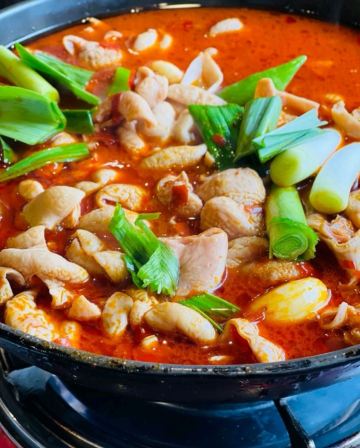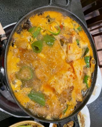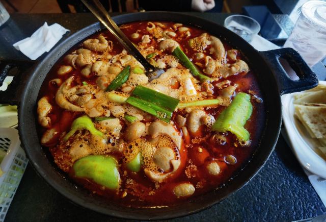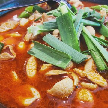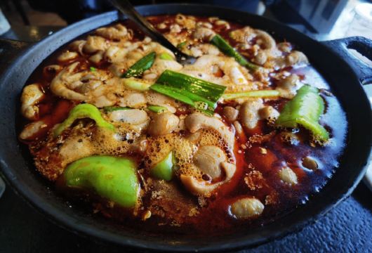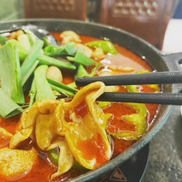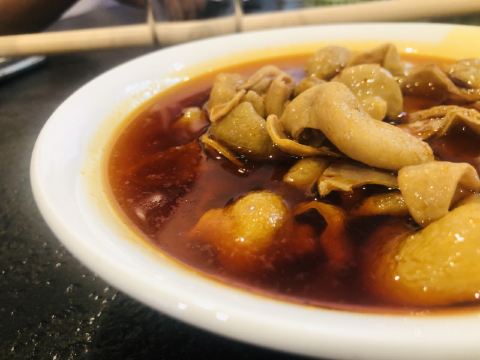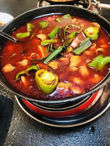 一家有年头的店 特色是肥肠火锅:入味,干净 我们喜欢搭配泡饼主食,饼分层处分开,稍微煮煮~~,那叫一个好吃! 配菜也算不少,各自喜欢。 特色还有酱板鸭,反正巨辣,老干妈猪脚筋好吃,不足处是有的有毛没弄干净