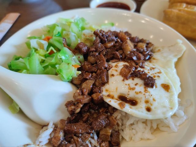 |台湾卤肉饭^吃过的数一数二的卤肉饭,太香了,带汁卤肉、青菜、鸡蛋和米饭均匀拌匀,饭菜肉蛋齐了,美味又健康! |油条^炸的特别脆,闻起来一股油香味,比永和大王的好吃。 |皮蛋粥^这个味道还可以,煮的很糯,就是皮蛋、肉切的太碎,不大方。 豆浆 好喝,豆味香浓。