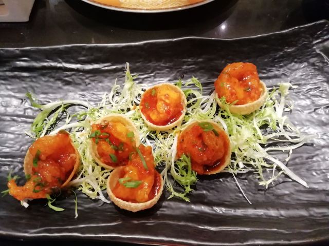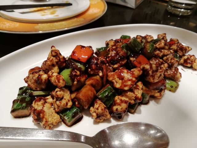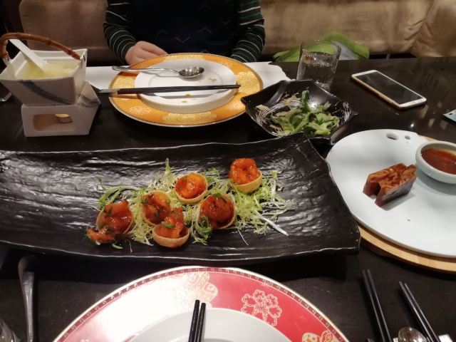 Chynna就餐环境高大上,都是软座,座位间距很大。 金盏鱼香渤海虾,虾仁新鲜,肉紧实,很大,味道清淡,摆盘漂亮。 酱爆香瓜黑豚肉,很大一盘,肉嫩且多。 五星级酒店的中餐厅,原料没的说,餐具讲究。适合情侣、老年夫妻、中年带孩子的在这里吃饭,慢慢吃慢慢聊。