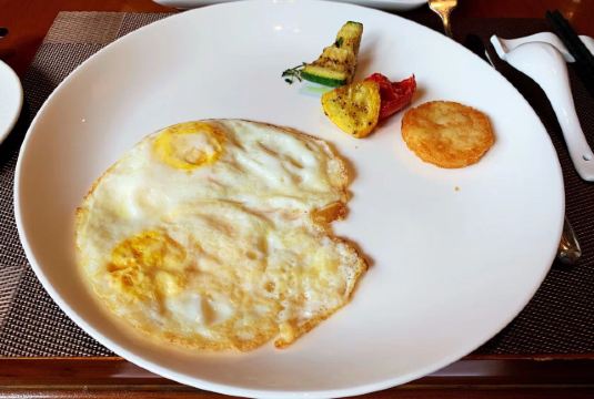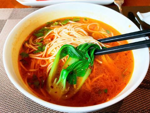 外观很中国风,很中式的装修,八仙桌的感觉,我觉得这里真要是吃日料都能吃出中式快餐的格调。 一杯茶;一盘水果品质还不错;煎鸡蛋还配了烤物蔬菜;还是想吃一碗重庆小面,没有太多麻辣味儿,口味算中等;烫时蔬口感反而是最佳。