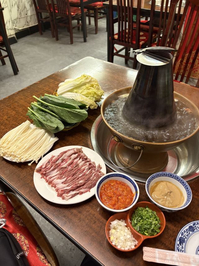 前门旅游区里的京味据点,提供正宗的清真火锅,食材保留原汁原味可无需蘸酱品尝。羊肉选用的是上好的锡林郭勒盟的蓝旗羊,只有腿肉,有磨档、黄瓜条和羊腱子可选。肉质很好,有柔和的光泽感,几乎不出血水。老板老张会在一旁耐心给客人解释涮羊肉的门道,让食客体验正宗的老北京涮肉。