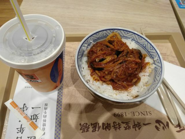这次吃了吉野家的鱼香肉丝饭,以前没有吃过的,这回尝一尝。可能点的客人不多吧,这个上餐有点慢,服务员说是需要把菜重新加热一下。