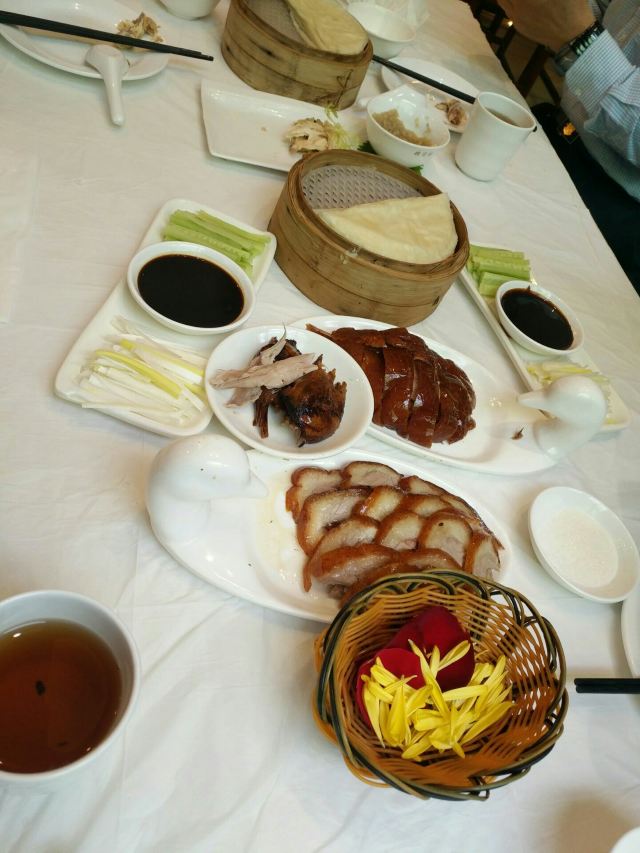 灵犀一动来这里吃北京烤鸭,是因为二十年前的这一天,我和爱人结婚旅行在大栅栏的便宜坊吃过烤鸭,记得那时我俩点了半只鸭子,只花了四五十块钱,爱人亲自给我用面饼卷了鸭肉,爱人还拍了几张我吃烤鸭的样子,二十年后的今天,我独自去了这里,想找到那家我们一起吃过的便宜坊,印象中似乎是这家,就走进去,店员说,这家店是大栅栏最早的一家便宜坊,不过,后来已经从大栅栏移到鲜鱼口了,我想,店址已经不是原先的地方,但应该是它了。点了半份鸭子,贵的要死,半份要127,还没有鸭架,只有一小盘少的可怜的鸭肉和几张薄饼,外加一小盆清鸭汤,我吃的时候,特意让店员用我的手机给我拍几张吃烤鸭的照片,烤鸭好吃,意料中的味道,没有什么特别,自己吃这么贵的鸭肉,初衷是对爱人的怀念与结婚二十周年的纪念,这次来北京,吃这半份烤鸭,怀着深深的爱念与使命,今生只有这一次。