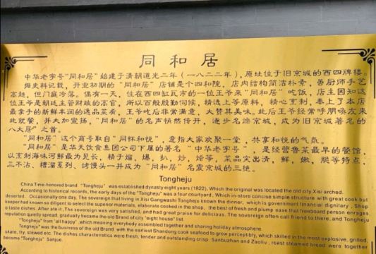 同和居是京城老字号餐厅,已有200年的历史,是旧京城八大居之首。同和居以“同怀和悦”之意命名,意指大家欢聚一堂,共享这和悦气氛。什刹海店地处荷花市场内,临水观山,可谓是闹中取静。坐在餐厅内,眺望熙攘的街景人群,凭栏观看后海风光,真可谓悠闲浪漫。而且同和居现悬挂的牌匾就是清末皇帝傅仪的胞弟傅杰亲笔所书。除了环境,菜品是同和居得以闻名于世的最大招牌。同和居名菜很多,其中葱烧海参、糟溜系列、贵妃鸡、三不沾、烩乌鱼蛋汤、烤馒头等这些名菜脍炙人口,深受食客喜爱。