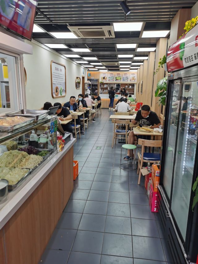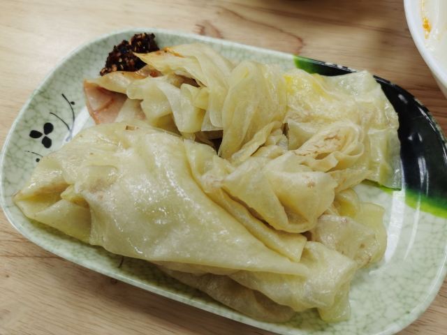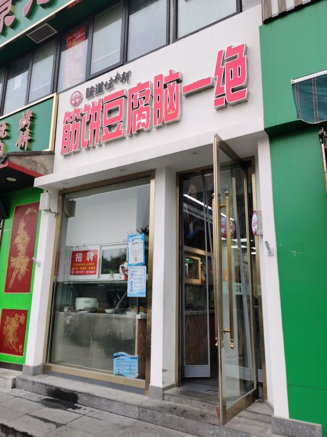 早上在万达附近觅食早餐,发现这家餐厅,第一次吃筋饼,的确是吃下去有点韧劲的感觉啊,加点辣吃真的是越吃越有味,豆腐脑也是满满一大碗,小哥提着酱壶把酱汁倒入雪白的豆腐脑,颜值高口味佳,发现很多本地人都在这里过早,的确是家不错的早餐店