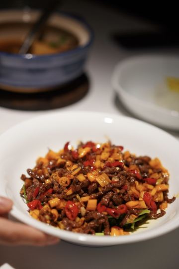 摆渡修行新荣记旗下的新品搞得红红火火 菜系定位比较苏浙菜 也有不少湘菜 暂且当是家常菜吧 ▹呛冬瓜 最爱的一道 凉菜做法 冬瓜汁水丰沛 一口下去就像熟透的水蜜桃一般甜软多汁 咸酸带点泡椒的微微辣 冰凉沁心又开胃 夏天能吃一打!绝配! ▹黄辣椒炒黑牛 ▹银芽炒鳝丝 两道小炒火候都很到位 尤其是韭菜豆芽 鲜嫩爽脆 还能带着镬气上桌 不错的 牛肉切成了和辣椒一般大小的“丁” 略微有点老 ▹金银蛋南瓜藤(夏季时蔬) ▹萝卜大肠煲 xrj做萝卜不失手 水嫩极了 大肠提前卤过 但吃起来远没有看起来那么入味 两位主角融合得也不够好 唯一不太满意的一道菜 ▹荣记95炒粉 湖南的圆粉 加鸡蛋青菜辣椒同炒 酱油色令人食欲大开 要夸的是粉的口感 滑溜弹韧 极好! ▹牛油果冰淇淋(xrj同款) 买单价格也和荣小馆差不多 性价比也可以 去晚了 水饺老鸭汤卖完 感觉会冲着这个来二刷 想吃记得预留。