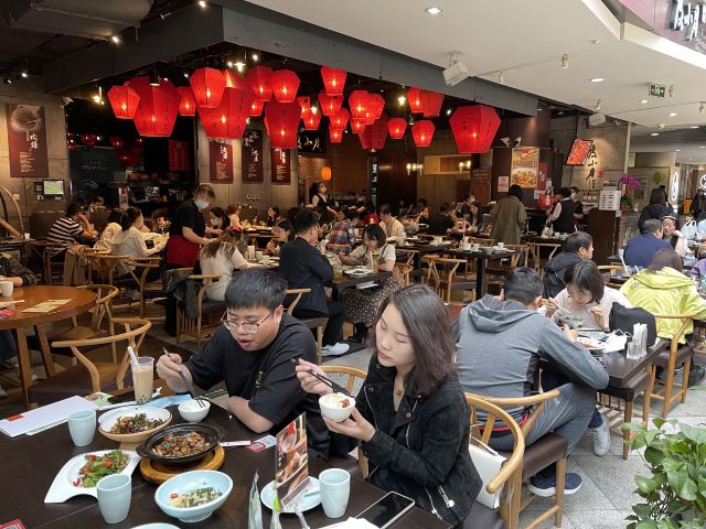 侨福芳草地杜小月餐馆周末饭点时间总是爆满。很多是回头客,在这家坐下吃饭不会踩坑。那里的肉燥饭,担仔面物美价廉,点几个小菜也不贵。现在不到二百元的套餐,可以吃到三杯鸡,蒸鱼和油条虾段及蔬菜。度小月菜式做得精致,讲究摆盘,菜量较小。 度小月的就餐环境有点拥挤,餐桌摆得很密,装饰环境有中国味。红灯笼上印有吉祥话语。