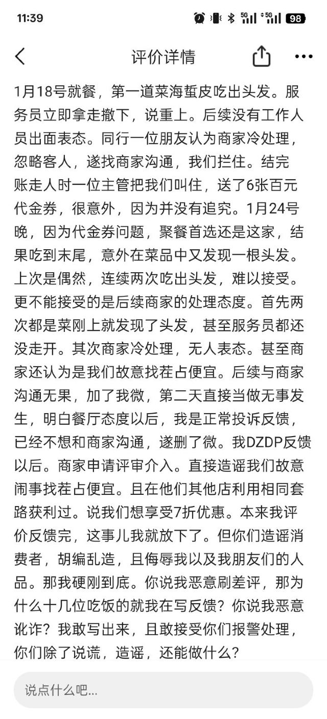 YoYo_5E6J3E9C1月18号就餐,第一道菜海蜇皮吃出头发。服务员立即拿走撤下,说重上。后续没有工作人员出面表态。同行一位朋友认为商家冷处理忽略客人,遂找商家沟通,我们拦住。结完账走人时一位主管把我们叫住,送了6张百元代金券,很意外,因为并没有追究。1月24号晚,因为代金券问题,聚餐首选还是这家,结果吃到未尾,意外在菜品中又发现一根头发。上次是偶然,连续两次吃出头发,难以接受。更不能接受的是后续商家的处理态度。首先两次都是菜刚上就发现了头发,甚至服务员都还没走开。其次商家冷处理,无人表态。甚至商家还认为是我们故意找花占便宜。后续与商家沟通无果,加了我微,第二天直接当做无事发生,明白餐厅态度以后,我是正常投诉反馈已经不想和商家沟通,遂删了微。我DZDP反馈以后。商家申请评审介入。直接造谣我们故意闹事找花占便宜。且在他们其他店利用相同套路获利过。说我们想享受7折优惠。本来我评价反馈完,这事儿我就放下了。但你们造谣消费者,胡编乱造,且侮辱我以及我朋友们的人品。那我硬刚到底。你说我恶意刷差评,那为什么十几位吃饭的就我在写反馈?你说我恶意让诈?我敢写出来,且敢接受你们报警处理你们除了说谎,造谣,还能做什么?