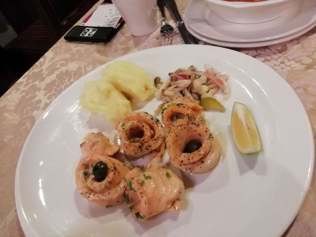 俄餐,环境不错,灯光亮度很好,暖融融的感觉。 餐前面包、红菜汤、牛排、三文鱼卷,味道不错。食材新鲜。 离东直门内非常近。