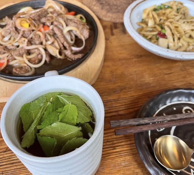 今天2大2小进五道营,随意找餐馆看到这家,太隐蔽了,差点以为没开店,刚好碰到出门的工作人员问了下才确认。点了招牌磨菇牛肉汤、马蹄拌豆腐、酸豆角小竹笋、紫苏煎鸡蛋、蛋炒饭后老板特地温馨提示这些菜基本都有不同辣 就加了一个火爆花心肥牛。以上每一道菜我都特别喜欢! 郡非常有特色!基本都光盘