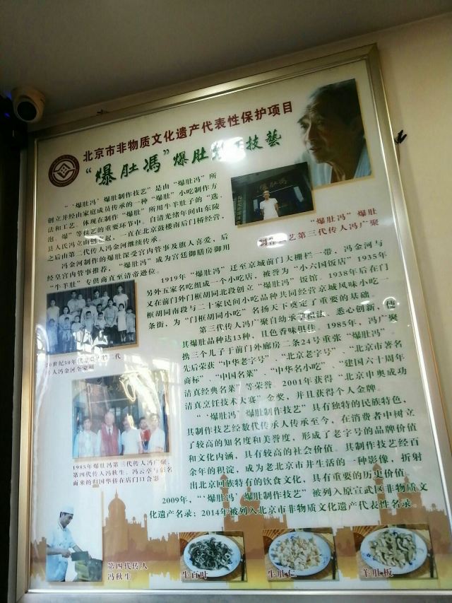 爆肚冯创始于光绪年间,是北京知名的老牌爆肚店。这家餐厅是爆肚冯的老店,很有老北京的范儿。这里的爆肚火候掌握的恰到好处,又脆又嫩,让人意犹未尽,肚仁儿之类的味道也都不赖,店家自制的小料味道更是让人回味无穷。