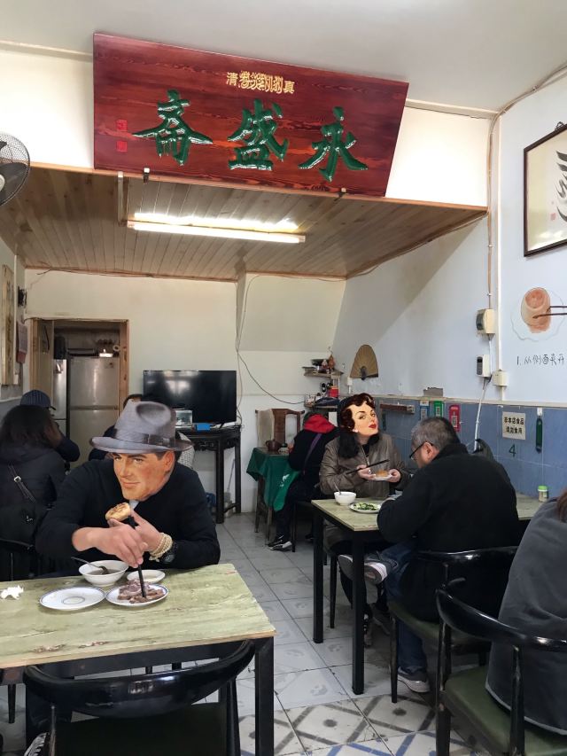 位置就在故宫博物院东边的骑河楼街,非常不起眼的小店,甚至门口都没有挂汉字的店匾(挂在室内啦[偷笑],图四),看见“40”就可以推门进入了(图三),可不要以为是居民住家哦,是实实在在的美味小店。店内朴实无华,桌椅两边排列,卫生还过得去。 男主人是粗放随意的北京人,女主人秀气干练;菜单在一进门的墙上(图五),付费在餐桌旁的墙上(图六);西墙上还漫画了怎么吃门钉肉饼,有意思;特别赞扬一下,他家的肉饼可以点一个,这在北京也不多见。 🥙口味:「门钉肉饼」(¥6/只):肉饼皮薄香脆,轻咬一口肉汁满满;再按墙上漫画介绍,略加少许香醋,即解油腻又添风味,实属散落在民间小巷中的北京美食。据网上up主介绍,小店肉饼已传承七代人,有兴趣的朋友可以去试试;「杂碎汤」(¥8):因为平时我不喜欢牛羊肉,只感觉杂碎汤没有那种我不喜欢的味道,还过得去吧。总之非常棒的肉饼,颠覆我对北京馅饼的认知。