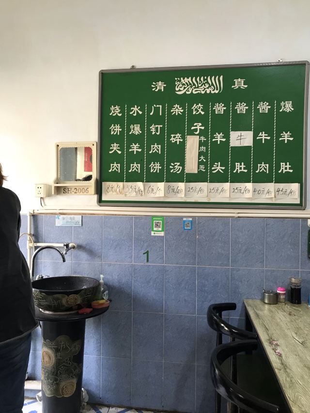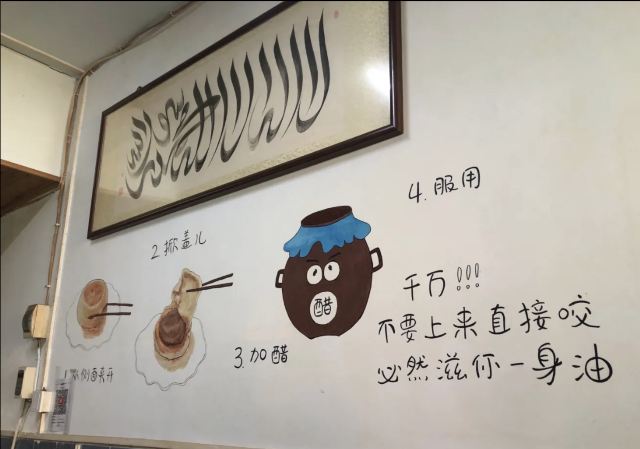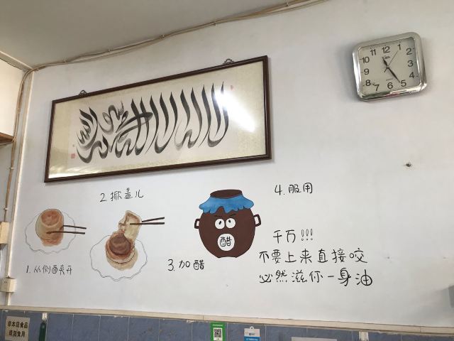 榴开百子位置就在故宫博物院东边的骑河楼街,非常不起眼的小店,甚至门口都没有挂汉字的店匾(挂在室内啦[偷笑],图四),看见“40”就可以推门进入了(图三),可不要以为是居民住家哦,是实实在在的美味小店。店内朴实无华,桌椅两边排列,卫生还过得去。 男主人是粗放随意的北京人,女主人秀气干练;菜单在一进门的墙上(图五),付费在餐桌旁的墙上(图六);西墙上还漫画了怎么吃门钉肉饼,有意思;特别赞扬一下,他家的肉饼可以点一个,这在北京也不多见。 🥙口味:「门钉肉饼」(¥6/只):肉饼皮薄香脆,轻咬一口肉汁满满;再按墙上漫画介绍,略加少许香醋,即解油腻又添风味,实属散落在民间小巷中的北京美食。据网上up主介绍,小店肉饼已传承七代人,有兴趣的朋友可以去试试;「杂碎汤」(¥8):因为平时我不喜欢牛羊肉,只感觉杂碎汤没有那种我不喜欢的味道,还过得去吧。总之非常棒的肉饼,颠覆我对北京馅饼的认知。