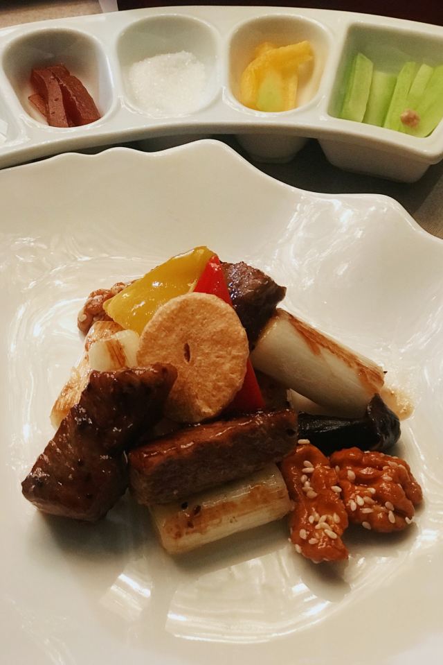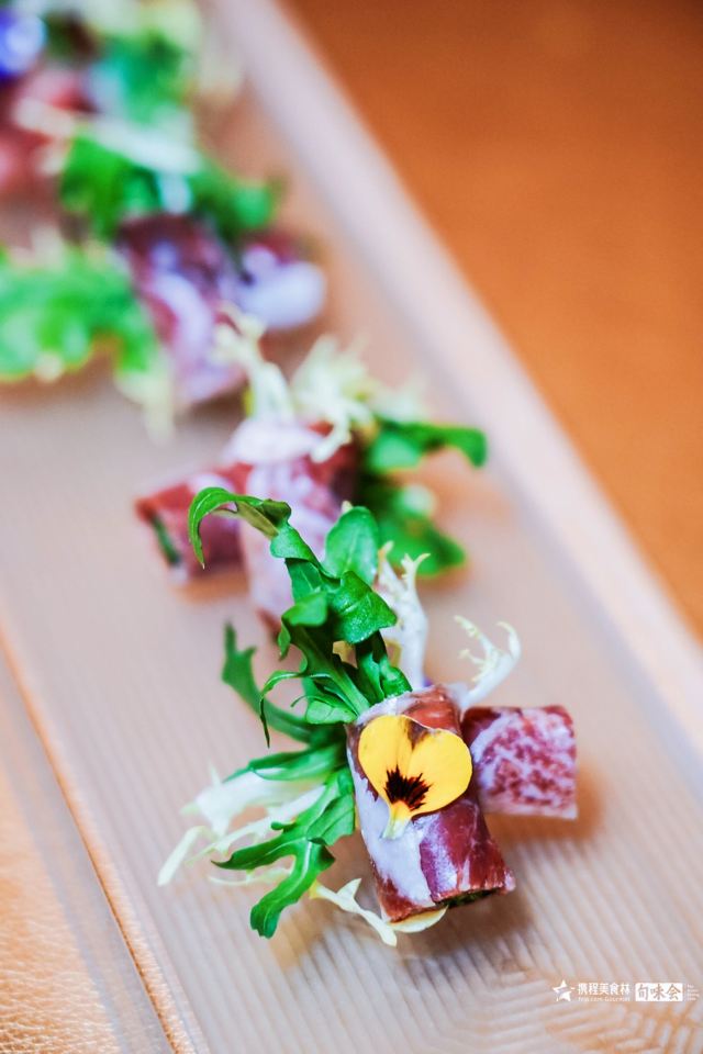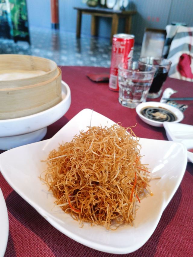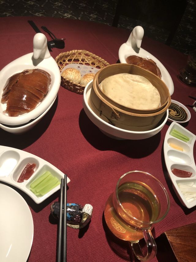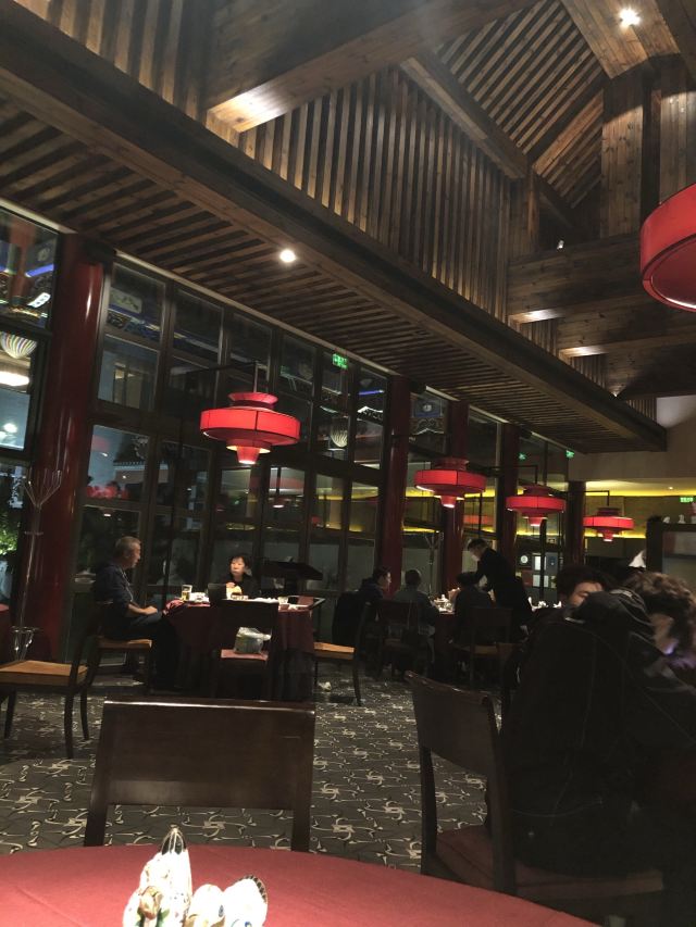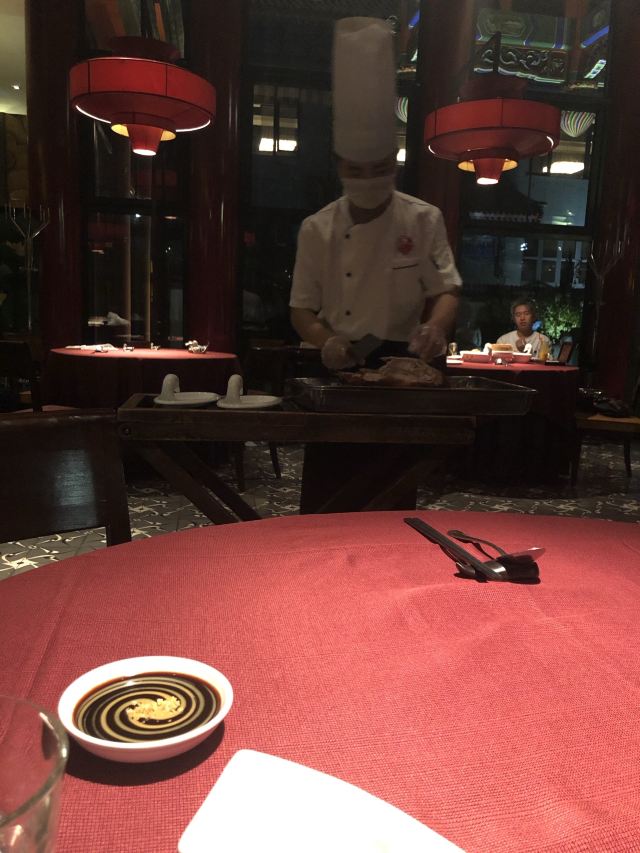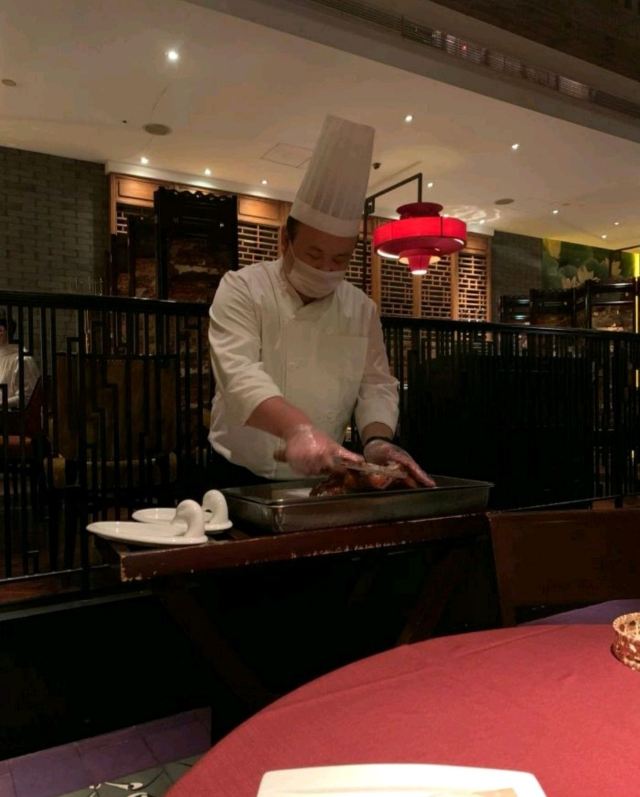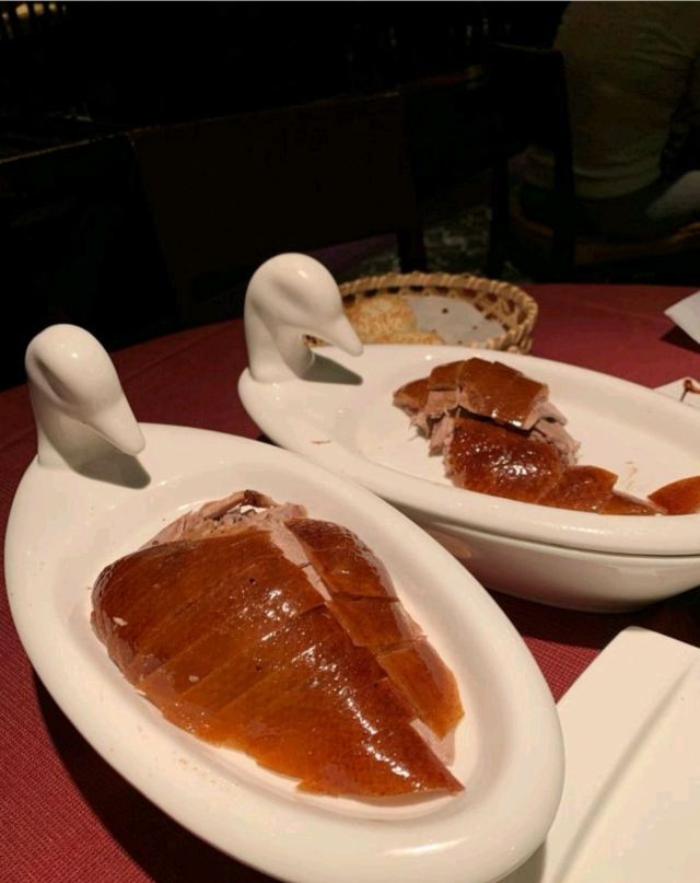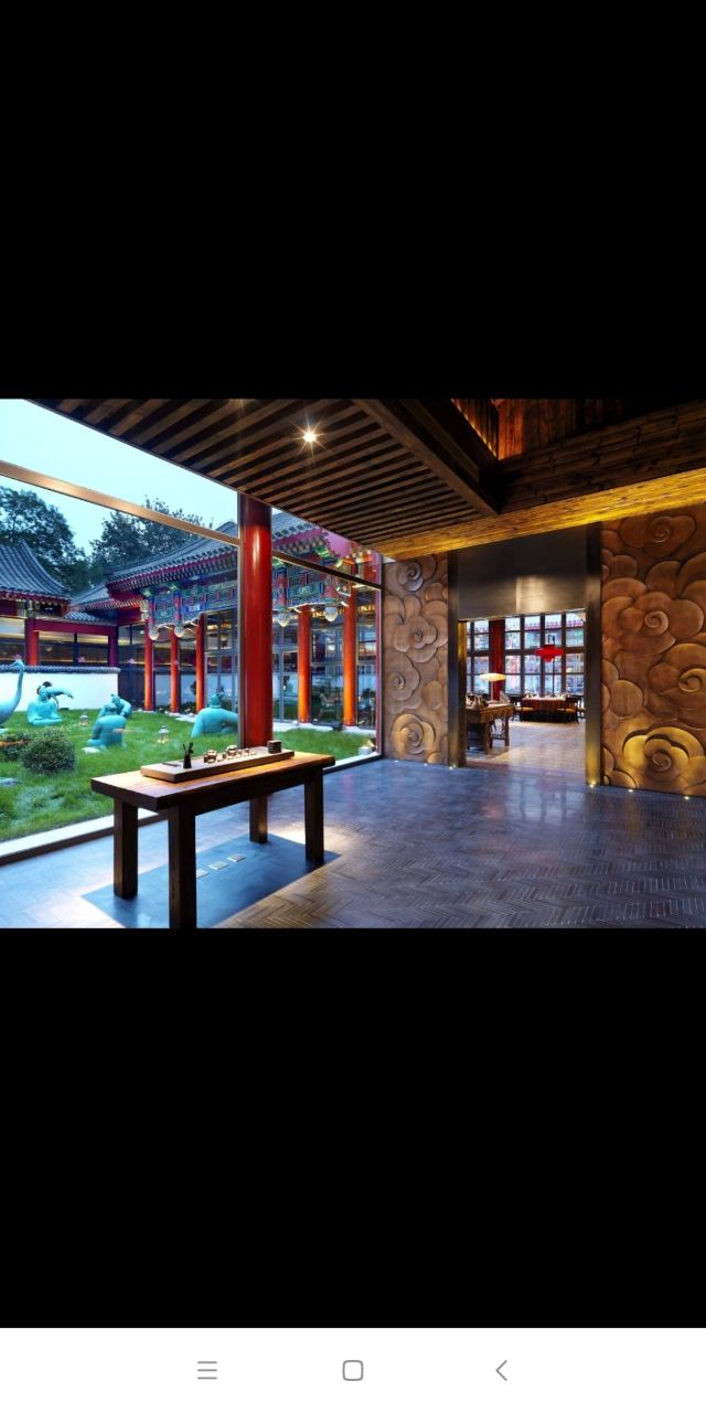 用脚下的路丈量这个世界【位置】 坐标金宝街,距离王府井也就两个红绿灯的位置,有自己的院子,可以免费停车。 【环境】 从院子进入就餐区经过一道厚重的木门,感应的,迎宾台就在门后,会有服务人员引领你进入大厅,经过长长的走廊,所谓的大厅,其实也就十几张桌子,分别排列在窗户两侧,每一侧窗户外都可以看到院子外的景致(不是停车场的院子,而是主建筑包裹的里面这一圈的院子,其实就是老北京四合院的意思),除了大厅,肯定还有很多包间。所以这里很适合商务宴请,低调奢华上档次的那种[偷笑] 【服务】 加收10%服务费的,所以服务肯定没的说,但也不是那种随时随地引殷勤的伴你左右的那种。就是你一招呼,立刻马上到面前,这也就够了,给大家充分的自由空间,不然总感觉在被监视,哈哈。 【口味】 手撕杏鲍菇^:因为只有两个人,除了烤鸭也点不了什么 吃了一个这个,还不错,油炸的东西总是让人难以拒绝。 皇帝鸭^:据说是混合品种,不会很肥,还有果香。但也没吃出来,烤鸭的精致程度跟大董不能比,最好的那几片皮也没有单独片出来,可能是不够自信。 总体来说,环境不错,够古朴典雅,菜品也算中规中矩吧。