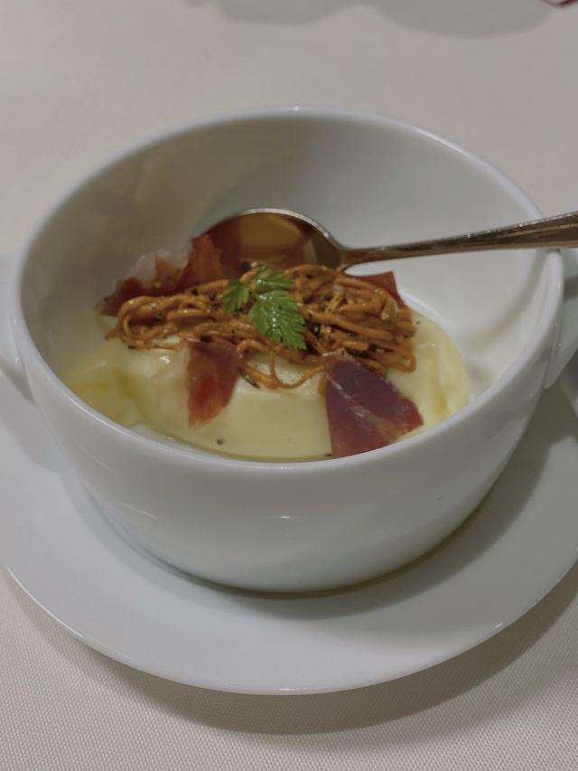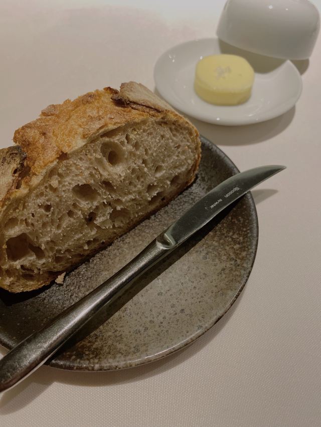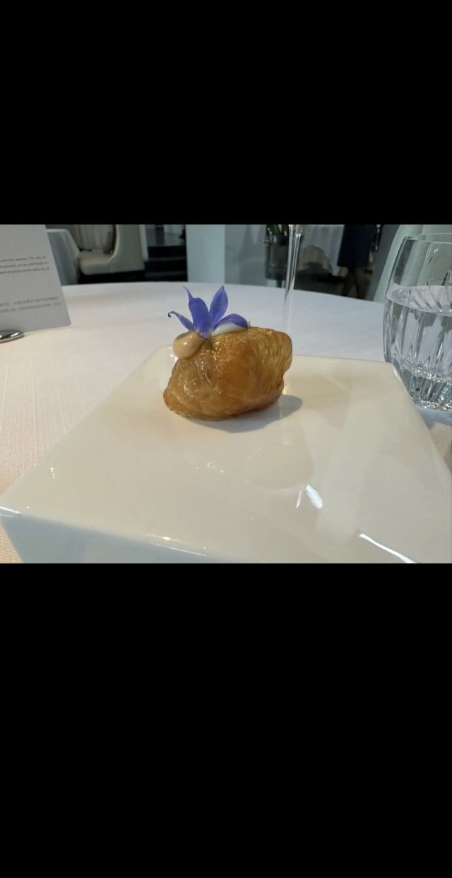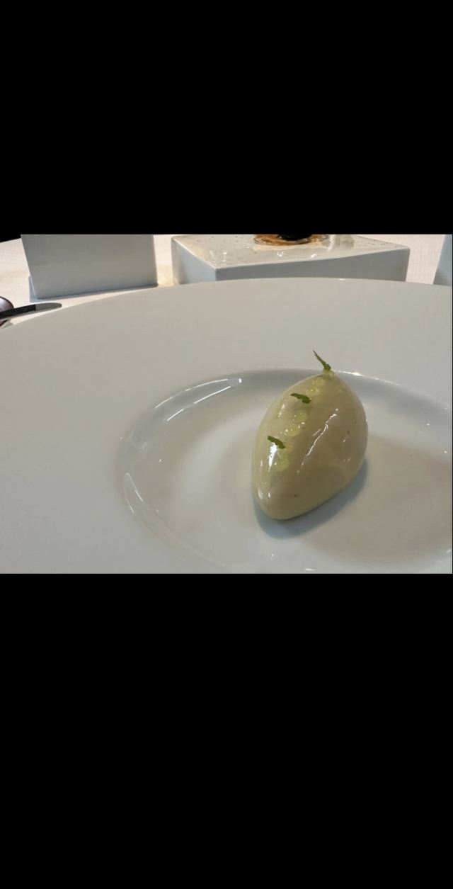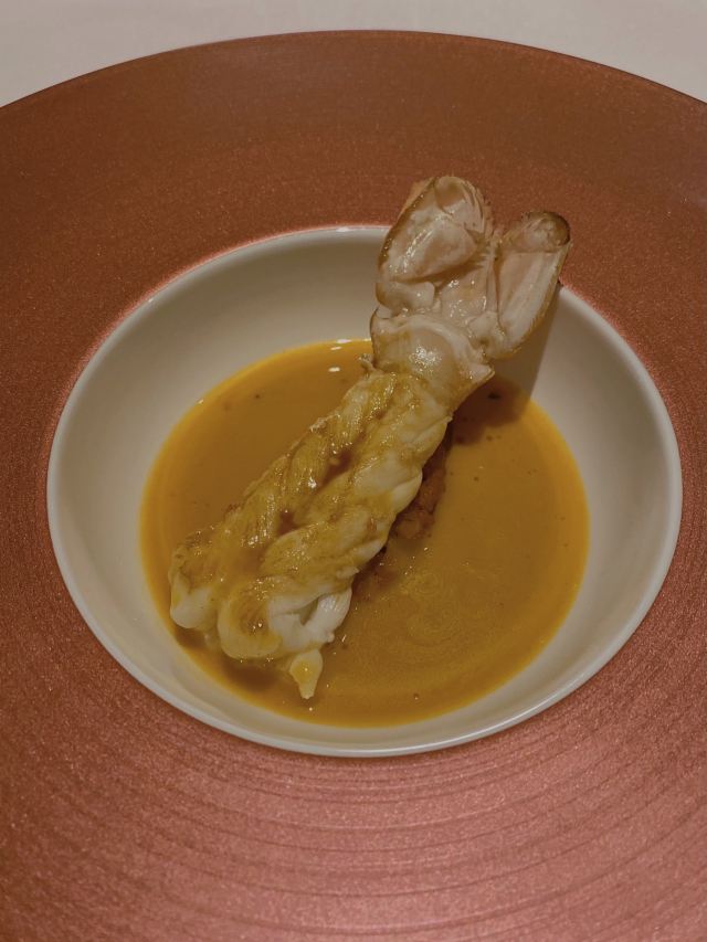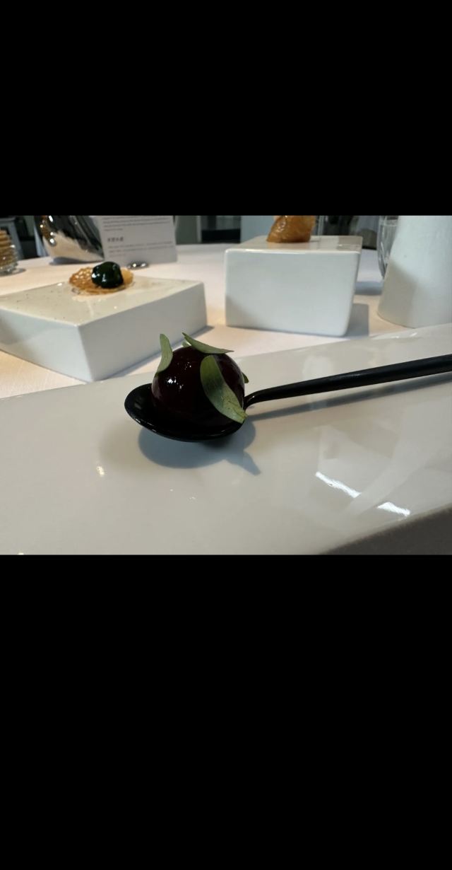 熊勃然Elsa「鱼子酱挞」 能吃出鱼子酱咸咸的味道,塔底是很薄很脆的那种,在鱼子酱和塔底中间还能吃出带子肉的感觉,咀嚼间还有一点点柠檬的香气。 「鹅肝泥」 咸口儿的鹅肝酱搭配着一块超小的饼底,鹅肝吃着有点腻,饼底因为鹅肝酱中的水分而变得有点湿软,失去了口感上的层次感。 「奶酪泡芙」 吃的时候还是温热的,里面是咸口儿的奶酪酱,还有人说吃出了黄芥末的感觉。 「栗子红薯慕斯」 红薯、板栗这两者感觉是非常秋天的搭配,外面罩着一层用法国甜酒做的啫喱来增添另一种风味,内里的慕斯吃起来是甘甜而有creamy的。 「餐前面包」 现在只提供了一种外观质朴的酸面包,搭配没有任何调味的黄油,感觉有点糊弄了。 「鳇鱼子酱 甜玉米泥」 从上到下依次是鳇鱼子酱、龙虾汤做的啫喱以及玉米慕斯,前两者的咸搭配着后者的甜,味道上还可以,不过作为前菜,感觉还是有点heavy了。 「日本金枪鱼塔塔 海藻乳沫」 上面是金枪鱼碎,下面是根芹碎,旁边搭配了三种不同的酱汁。个人觉得金枪鱼的部分有点腥,和下面的根芹也不是很融合的感觉。棕色的酱汁是甜甜的,绿色和白色的酱是偏creamy的感觉。 「海熬虾」 海熬虾下面配的是手捣的日本樱桃番茄,淋的酱汁是用大闸蟹做的酱汁。海熬虾吃起来QQ弹弹的,味道十分甘甜,番茄吃起来很像意面的罗勒红酱的感觉,整体上的味道就是咸鲜甜微酸。 「金目鲷 马赛鱼汤酱」 鱼肉的皮不脆,本身味道也很清淡,马赛鱼汤酱也比较清淡,旁边搭配的另外两种酱汁味道上比较清新,但也都属于清淡挂的。配菜的莴笋和芦笋烹饪得有些过了,软软的不够脆嫩。 「牛肉 波尔多红酒酱」 牛肉用的是M9级别的,熟度做成了medium,外脆里嫩。配菜是牛肝菌和菠菜泥,菠菜吃出了一点点苦味。酱汁有红酒酱和黑松露酱,但没有吃出两种酱的特别风味。 「土豆泥」 搭配牛肉的土豆泥上面点缀了虫草花和西班牙5J火腿,味道中规中矩。 「芒果 热情果 香草沙巴庸」 芒果摆成了花的样子,下面是香草沙巴庸,旁边搭配了百香果酱、柠檬酱以及日本黑糖酱。沙巴庸里面据说还放了香槟,不过我倒没有吃出来,口中就只是类似化了都冰淇淋一样creamy的口感。芒果本身品质不错,所以这道甜品不算难吃。 「费南雪」 换了个形状,差点没认出来。最上面点缀了一点樱桃酱,多了一丝酸味来解腻。 「可露丽」 全场最佳,外脆里嫩,是一颗完美的可露丽该有的样子。