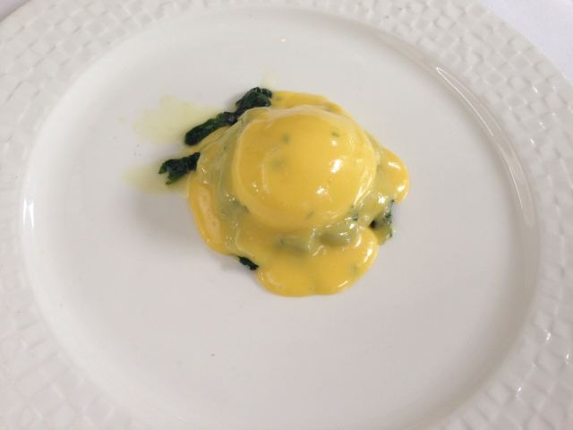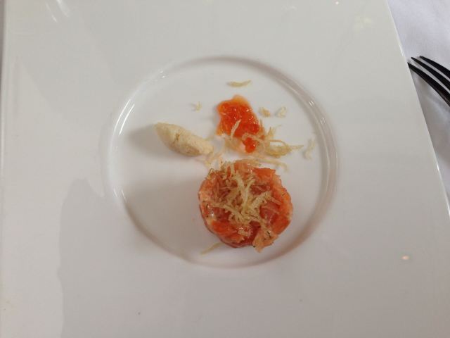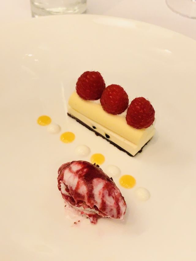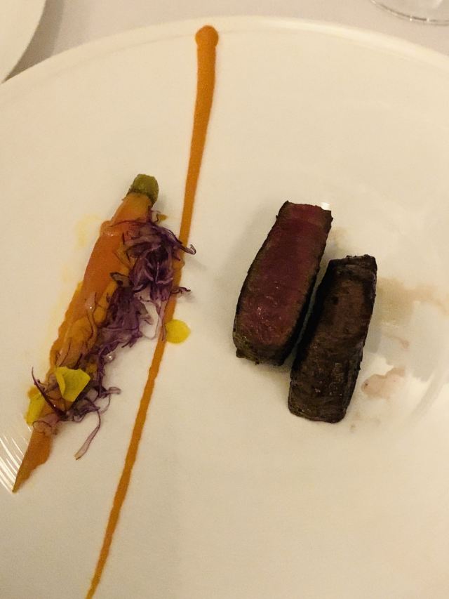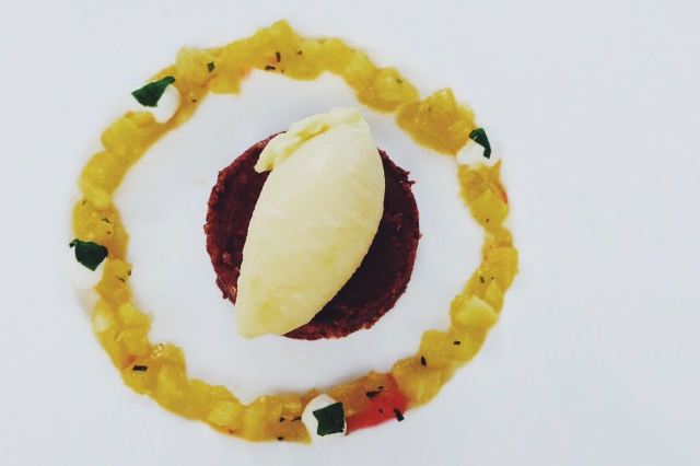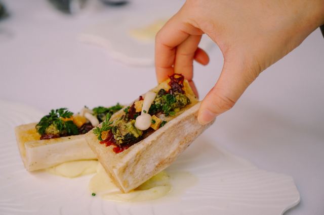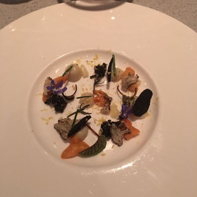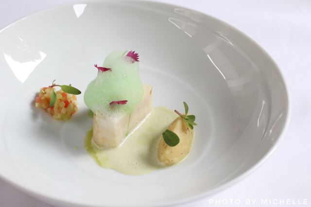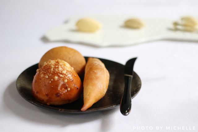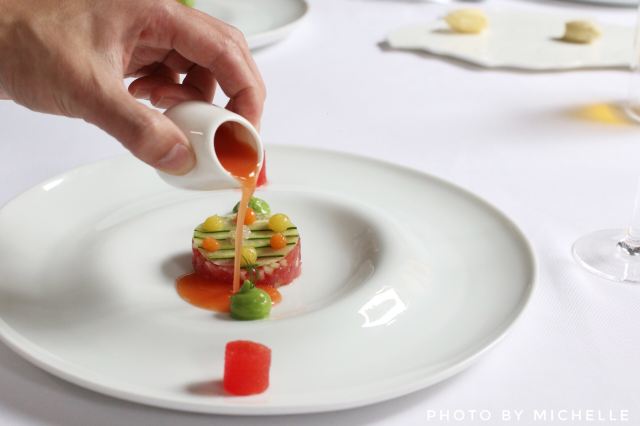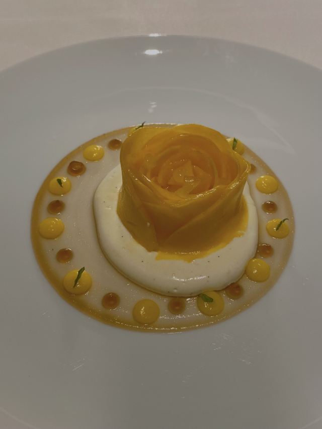 熊勃然Elsa「鱼子酱挞」 能吃出鱼子酱咸咸的味道,塔底是很薄很脆的那种,在鱼子酱和塔底中间还能吃出带子肉的感觉,咀嚼间还有一点点柠檬的香气。 「鹅肝泥」 咸口儿的鹅肝酱搭配着一块超小的饼底,鹅肝吃着有点腻,饼底因为鹅肝酱中的水分而变得有点湿软,失去了口感上的层次感。 「奶酪泡芙」 吃的时候还是温热的,里面是咸口儿的奶酪酱,还有人说吃出了黄芥末的感觉。 「栗子红薯慕斯」 红薯、板栗这两者感觉是非常秋天的搭配,外面罩着一层用法国甜酒做的啫喱来增添另一种风味,内里的慕斯吃起来是甘甜而有creamy的。 「餐前面包」 现在只提供了一种外观质朴的酸面包,搭配没有任何调味的黄油,感觉有点糊弄了。 「鳇鱼子酱 甜玉米泥」 从上到下依次是鳇鱼子酱、龙虾汤做的啫喱以及玉米慕斯,前两者的咸搭配着后者的甜,味道上还可以,不过作为前菜,感觉还是有点heavy了。 「日本金枪鱼塔塔 海藻乳沫」 上面是金枪鱼碎,下面是根芹碎,旁边搭配了三种不同的酱汁。个人觉得金枪鱼的部分有点腥,和下面的根芹也不是很融合的感觉。棕色的酱汁是甜甜的,绿色和白色的酱是偏creamy的感觉。 「海熬虾」 海熬虾下面配的是手捣的日本樱桃番茄,淋的酱汁是用大闸蟹做的酱汁。海熬虾吃起来QQ弹弹的,味道十分甘甜,番茄吃起来很像意面的罗勒红酱的感觉,整体上的味道就是咸鲜甜微酸。 「金目鲷 马赛鱼汤酱」 鱼肉的皮不脆,本身味道也很清淡,马赛鱼汤酱也比较清淡,旁边搭配的另外两种酱汁味道上比较清新,但也都属于清淡挂的。配菜的莴笋和芦笋烹饪得有些过了,软软的不够脆嫩。 「牛肉 波尔多红酒酱」 牛肉用的是M9级别的,熟度做成了medium,外脆里嫩。配菜是牛肝菌和菠菜泥,菠菜吃出了一点点苦味。酱汁有红酒酱和黑松露酱,但没有吃出两种酱的特别风味。 「土豆泥」 搭配牛肉的土豆泥上面点缀了虫草花和西班牙5J火腿,味道中规中矩。 「芒果 热情果 香草沙巴庸」 芒果摆成了花的样子,下面是香草沙巴庸,旁边搭配了百香果酱、柠檬酱以及日本黑糖酱。沙巴庸里面据说还放了香槟,不过我倒没有吃出来,口中就只是类似化了都冰淇淋一样creamy的口感。芒果本身品质不错,所以这道甜品不算难吃。 「费南雪」 换了个形状,差点没认出来。最上面点缀了一点樱桃酱,多了一丝酸味来解腻。 「可露丽」 全场最佳,外脆里嫩,是一颗完美的可露丽该有的样子。