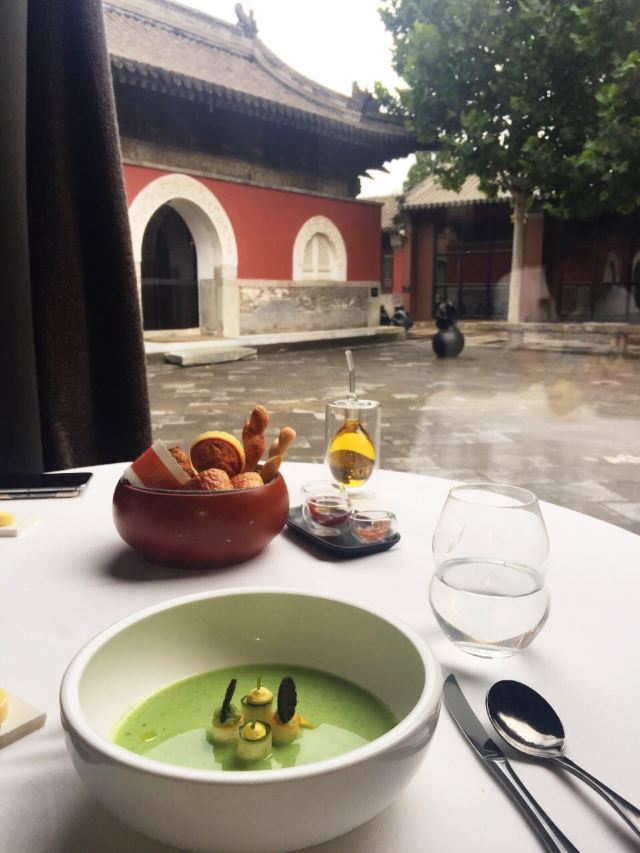 餐厅隐匿于数百年历史的古刹之内,红墙苍松别具古韵,内部装修简约现代,古典与现代风格的强烈对比带来奇特的视觉享受。店内主打法餐,以精致摆盘和纯正口味而闻名,广受食客的青睐与赞誉。