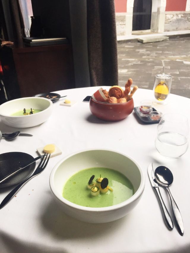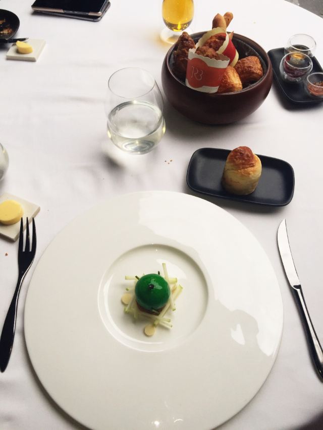 嘎兰米其林北京餐厅ing 见证了TRB在北京的渐变之路,再次回到创始店,环境依旧,服务up餐品质量也在不断进步谦逊了,原有的仪式感持续保持,也是夺得米其林推荐的先觉。不过我们一致认为菜品的确还有上升空间。 餐前小食和小杯气泡酒的前戏十足诚意,清爽开胃。刚刚滑雪归来的朋友居然喝完有点小醉,烛光更加迷离了[捂脸] 接下来的鹅肝、扇贝一股脑都匀给了我,一人吸收double着实有点吃不消了。TRB每一道菜品尤其主菜执着于酱汁的调配,服务生仪式感的确有了,以至酱重于食材本味,想象许多食材一股脑涌进舌喉,省去了前调中调,后调是调和一体的,一早起来回味半天居然忘记昨晚吃了什么影响至深的食味呢。