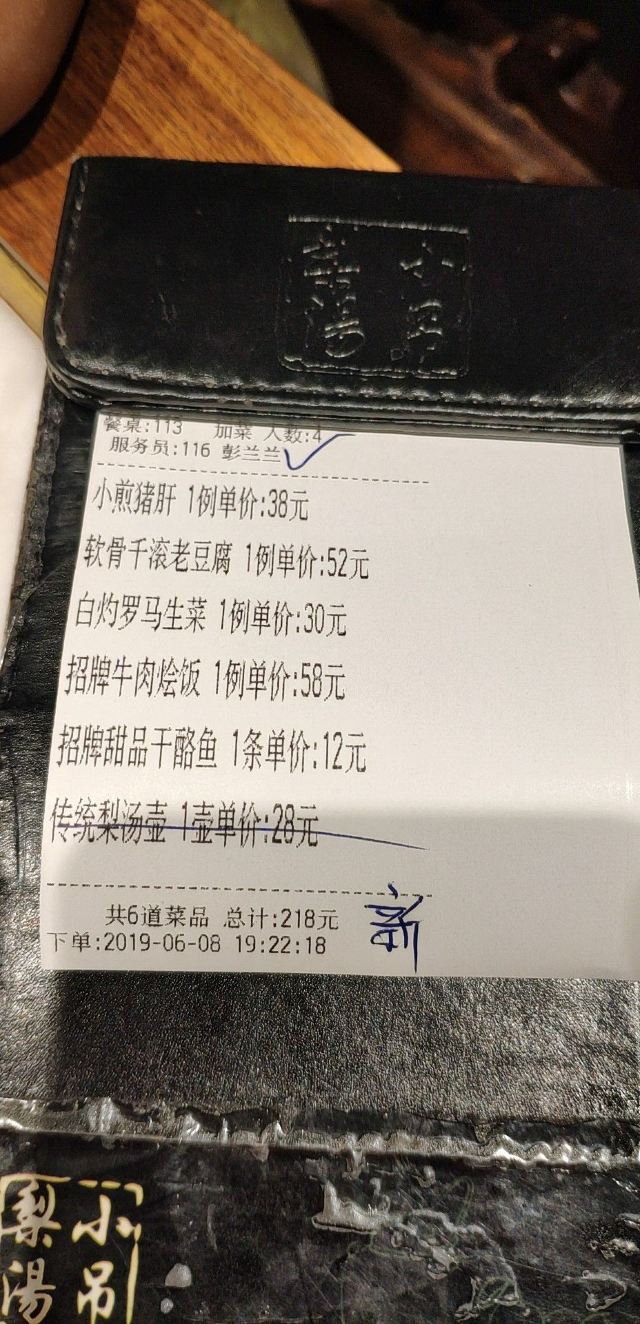 YoYo_3I7F0H6Q本来不在计划中的店。只是因为恰好在这附近又特别饿就决定来试一试了。 以为会踩雷,却意外的好吃。 工作日晚上8点多去的,还排队排了15分钟左右。不过服务员态度蛮好,手机没电了收银还帮我充了电。 两个人点的每一样菜都很满意。 【小吊梨汤】真的好喝,北京太干了,梨汤解渴润肺,淡淡的甜,也不粘嗓子。一壶两个人根本喝不完,最后打包了,可以选择花2元钱买个玻璃瓶打包,也可以不花钱用纸杯装。 【干酪鱼】以为会特别腻,没想到口味刚刚好。一只鱼三口两口就被我跟老公解决了。 【卤肉烧土豆】很下饭,咸咸的但是不会齁。 【炸馒头】量很足,10块钱这么多两个人没吃完,馒头的口感很好,蘸酱也是我喜欢的味道。 【小煎猪肝】我本来就喜欢吃猪肝,这个炒的又特别对我口味,全吃光了。 【梨球虾】我们俩本来都不喜欢吃酸甜口的,这个菜却觉得还不错。除了最后几个梨球没吃完,虾被我们都吃了。虾挺大只也新鲜,赞一个。 总体来说就是超出预期,而且价格也不算贵,性价比很高。推荐!