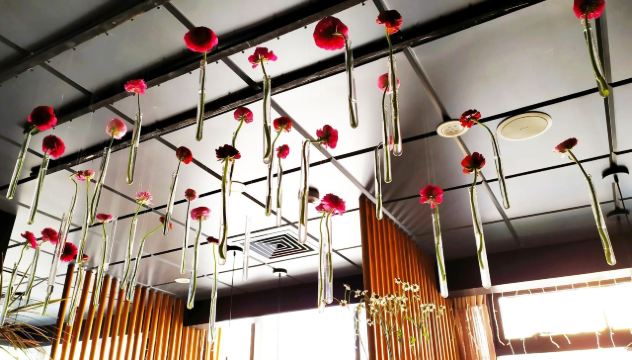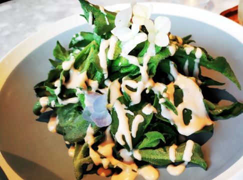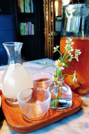 懒人盐府位于航天桥东北角,要从门口有两座白石象的大门口进入二层。一进店就犹如置身花海,各色鲜花,造型各异的花瓶,吊在天花板上的小型花海,每桌上放置的小花,令人瞬间心情愉悦,文艺清新的氛围浓厚。 猪蹄十分软烂脱骨,微微带辣,味道也极好。爽口冰草中规中矩,大麻鱼很鲜,麻中带辣,豆芽也入味很香。马蹄甘蔗水太好喝了,甜甜的,有着甘蔗的甜香,隐隐还有些玉米香,配上马蹄,既去火又好喝。米酒甜香不仅好喝,透明的小酒瓶,小酒杯以及配的小花,使用餐添加了小清新范儿。唯一不好吃的就是竹荪蛋炒青笋,味如白水清煮,西红柿如生切直接放入,不推荐。 整体喜欢这家店的用餐氛围,贴心服务,菜品也还不错。