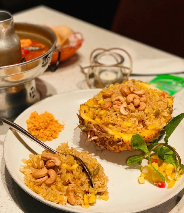 冬阴功汤,泰国虾片,青柠蒸鲈鱼,香炸虾饼配酸甜汁,菠萝饭配腰果和肉松,黄咖喱牛腩,辣炒空心菜(虾酱),曼谷街边的青木瓜沙拉,芒果鲜虾沙拉,鸿运当头咖喱蟹炒鸡蛋,鲜虾粉丝沙拉,菠萝饭,辣炒空心菜,香茅草烤鲈鱼