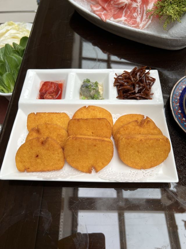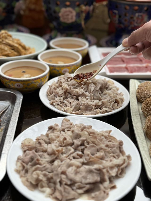 日坛涮肉位于使馆区,在一个庭院里,装饰风格很有帝王范儿,明清式的桌椅,景泰蓝的锅,还可以在院子里吃露天火锅,感觉很不错。这里采用的是一人一锅的方式,地道的老北京涮羊肉,羊肉和奶香肥牛原料新鲜,切的摆的都很漂亮,日坛烧饼非常赞,一定要点。