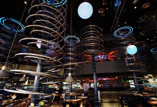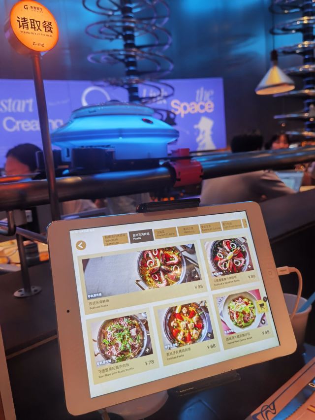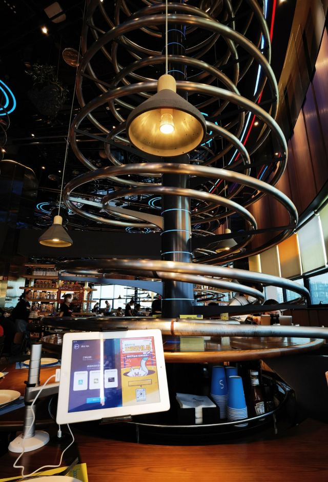 这是一家来自德国的餐厅,2015年的时候从德国来到中国,我打卡的这家餐厅是北京的第二家连锁店。这是一家超级帮的网红餐厅,很强烈的科技感设计,配上金属干的轨道送餐方式,一定会让你大饱眼福和口福的。