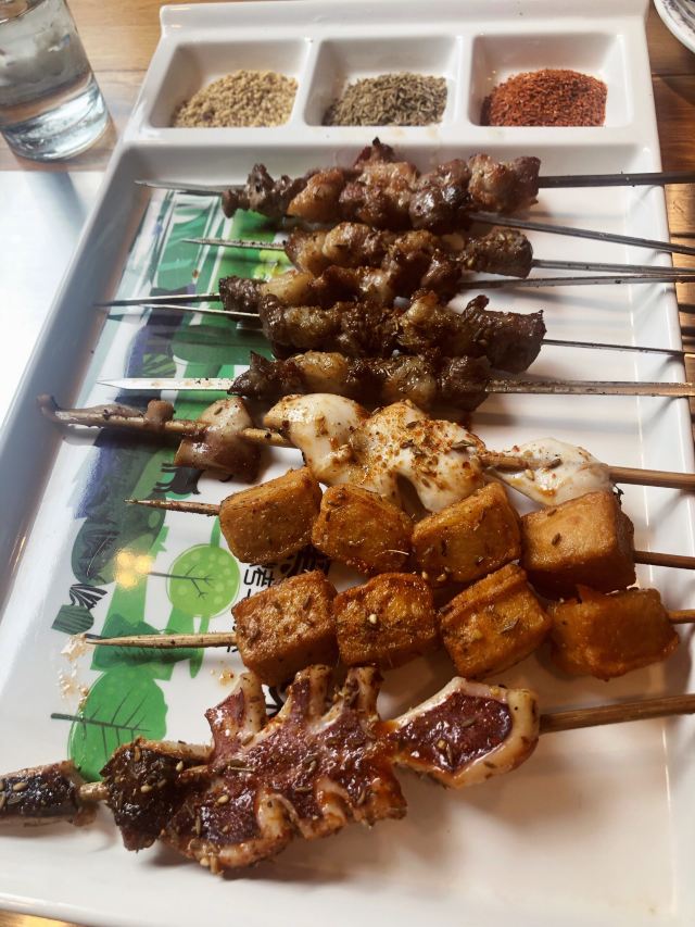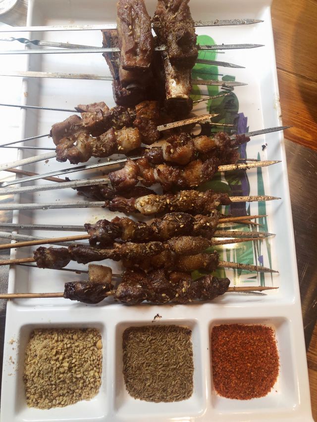 招牌烤羊腿,羊肉串,拍黄瓜,疙瘩汤,蘸料,烤羊排串,烤鸡翅,烤生蚝,花生,大东北烤护心肉