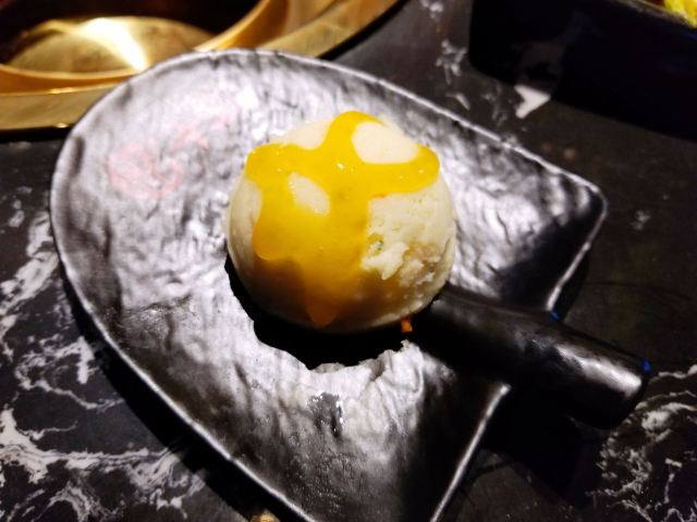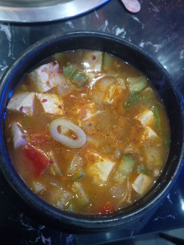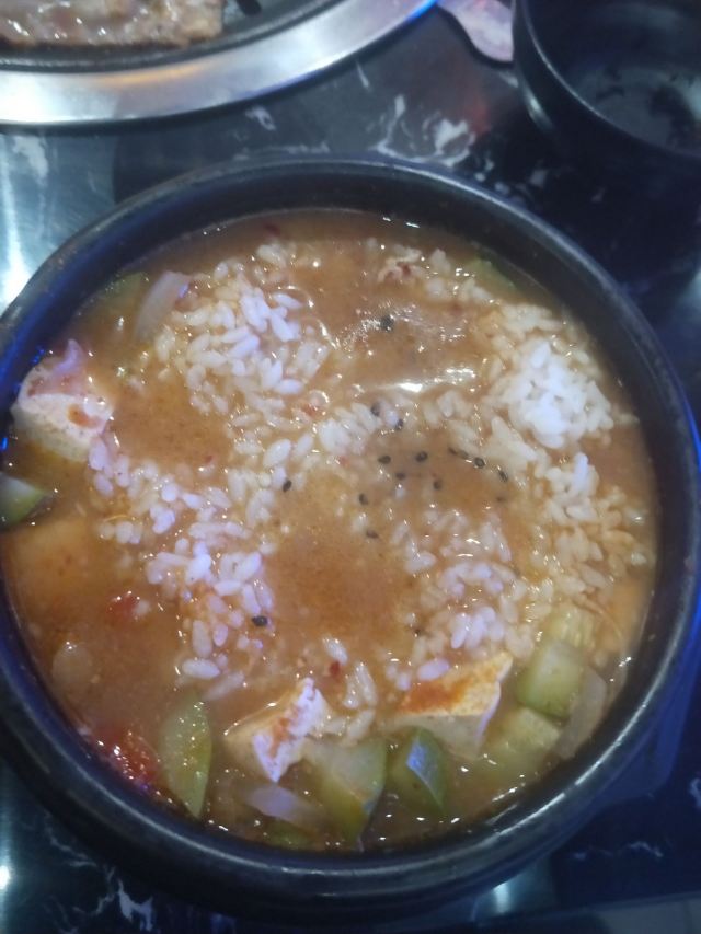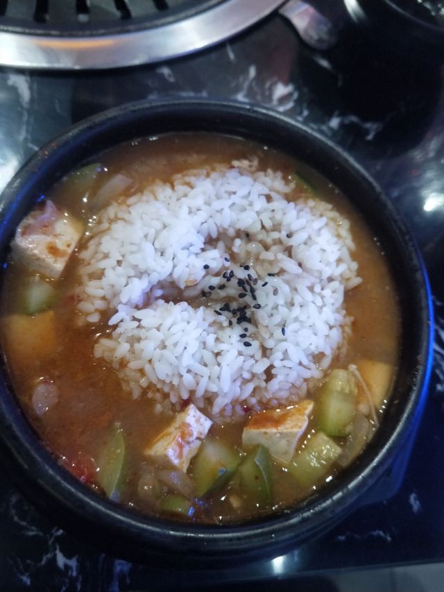 十三阶梯烤肉包含的那份布丁不怎么好吃,就像是糖水泡的。烤肉还行,但它家火比较大又不给油,肉要么烤不熟,要么就烤糊了。大酱汤我觉得很一般。